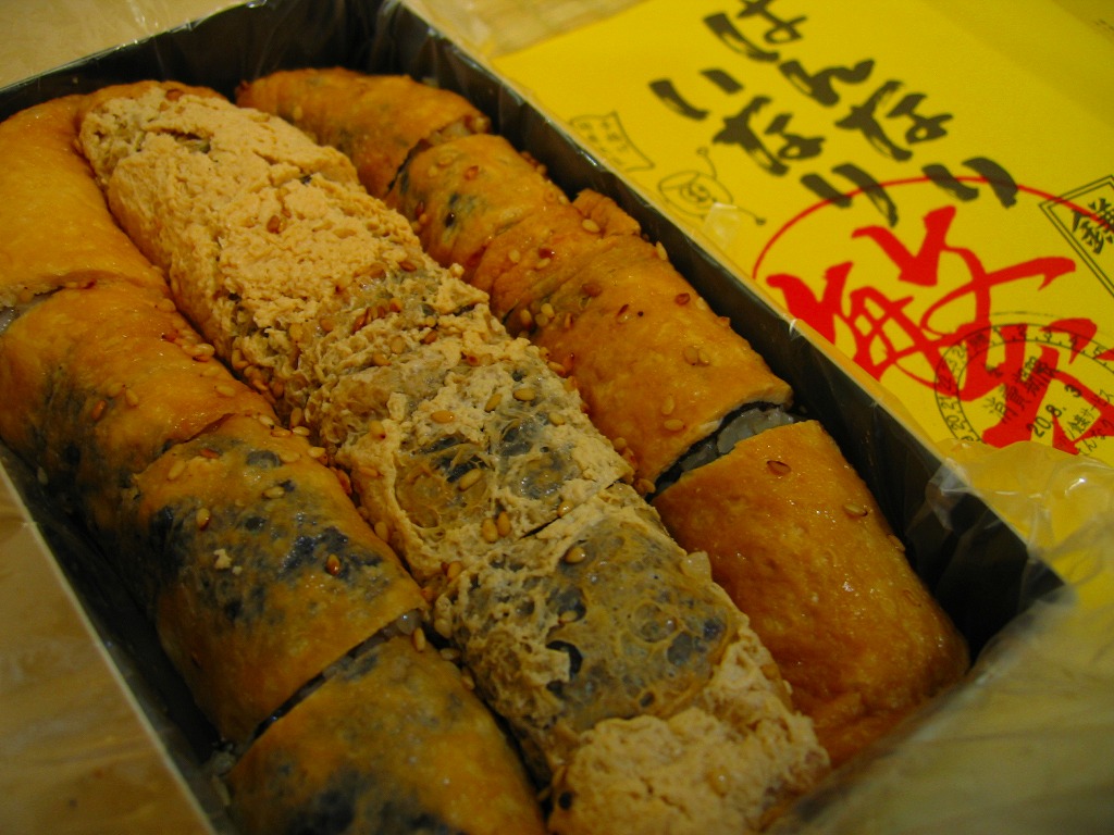 小田原駅の駅弁売店で買えた稲荷寿司。ふたに宣伝文を印刷したボール紙製の紙箱に黄色い掛紙を巻いている。中身は黒ゴマや黒ミツを混ぜて黒くなった酢飯を海苔と油揚げで巻いた、棒状のおいなりさんが3本、それぞれ4切れにカットしてぴったり収めるもの。風味はふんわり、適度なサイズと水気で口にポンポン入っていく。