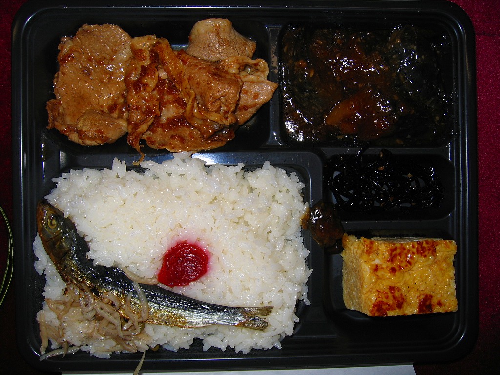 小田原駅の橋上自由通路でブース販売されていたお弁当。プラ製の惣菜容器に、弁当名を大きく記した掛紙をかけて、濃緑色の輪ゴムでしばる。中身は日の丸御飯に豚生姜焼やナスや小魚や玉子焼など、内容も味も格別なものはないし地域色もない。