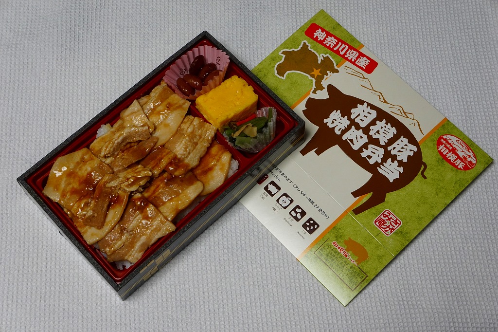 2017(平成29)年の発売か。小田急電鉄の孫会社の「さがみ庵」ブランドの弁当で、小田原駅に限らず、小田急電鉄の駅売店「Odakyu OX」各店で売られる模様。長方形の容器に透明なふたをして、商品名に神奈川県と豚のシルエットをデザインしたスリーブに収める。白御飯を9切れの豚バラ焼で覆い、玉子焼と小松菜と金時豆を添える。水気の少なさも常温の味も、JRの公式な駅弁屋の駅弁と同じような感じ。豚は薄くて柔らかく、タレの味が出て臭みのない、今風の豚丼。2019年までの販売か。