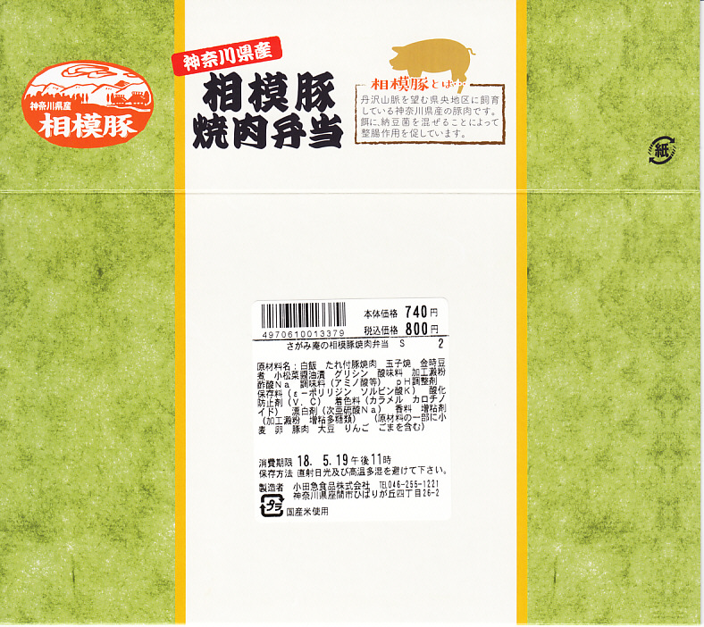 2018(平成30)年5月13日に購入した、小田原駅弁の掛紙。上記の2022年のものと、絵柄も中身も同じ。価格と、食品表示ラベルの記載量が異なる。
