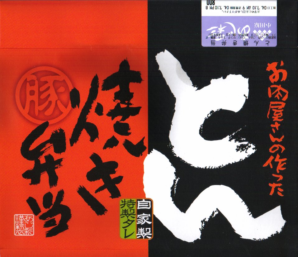 トレーを入れたボール紙パッケージの中に、日の丸御飯ととても柔らかな国産豚ロース肉生姜焼に、ポテトサラダやフライドポテトや生野菜などを詰める。小田原駅自由通路内の駅弁山積売店で入手した、小田原市内の食肉店兼惣菜屋の駅弁風弁当で、肉屋と惣菜部門で使い分けるのか、同じ調製元の「箱根めぐり道中おにぎり」と比較して、調製元の電話番号が1番だけ異なる。価格は2004年の購入時で800円、2015年時点で980円。2021年頃までの販売か。2024年までに「箱根山とん焼&蕎麦つゆしゃぶ弁当」(1,180円)を発売。