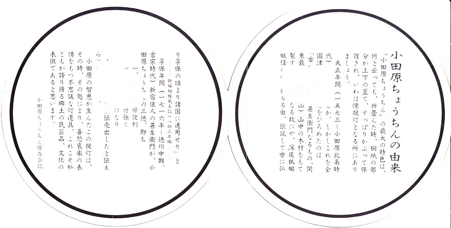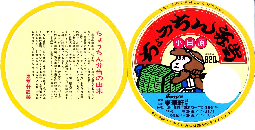 1990年代のものと思われる、昔の小田原駅弁の掛紙。小田原駅のちょうちん弁当はこの頃の名物駅弁で、小田原ちょうちんを模した円筒形の容器を使う駅弁だった。容器に載せた折りたたみの紙片に、ちょうちん弁当と小田原ちょうちんの由来がぎっしり記される。