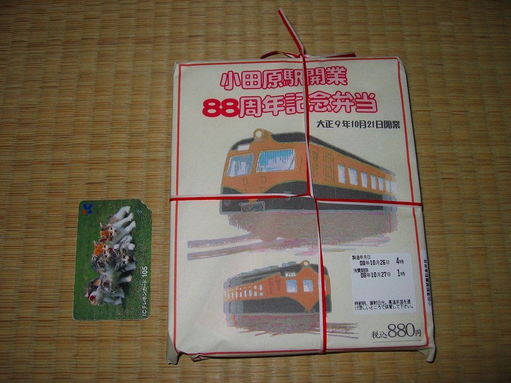 小田原駅の橋上コンコースのウォークイン売店前で、小田原や箱根湯本の駅弁に混じり販売されていたお弁当。プラ製の惣菜容器に紙帯を締め、その帯には小田急線開業80周年のロゴマーク、縮小がきついが当時の全線俯瞰図、おしながきが描かれる。