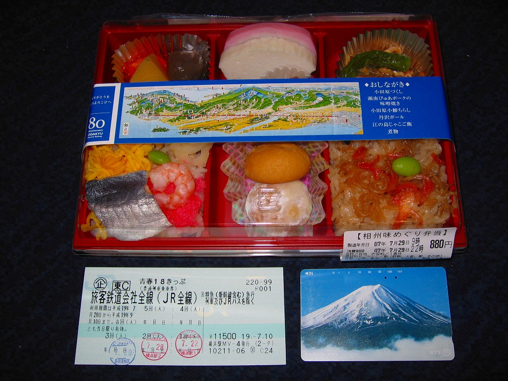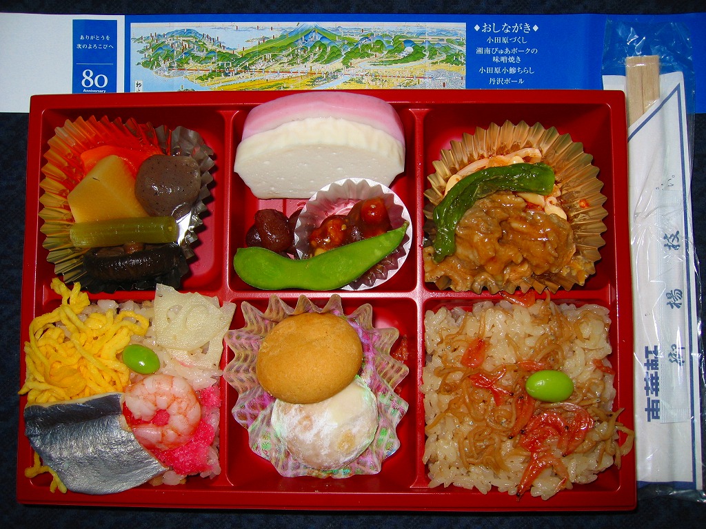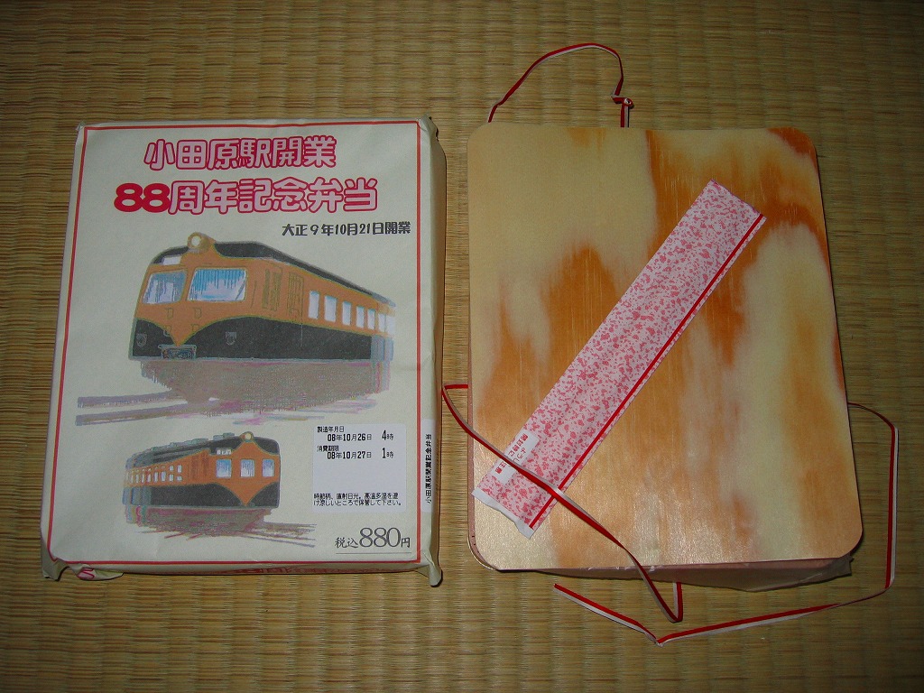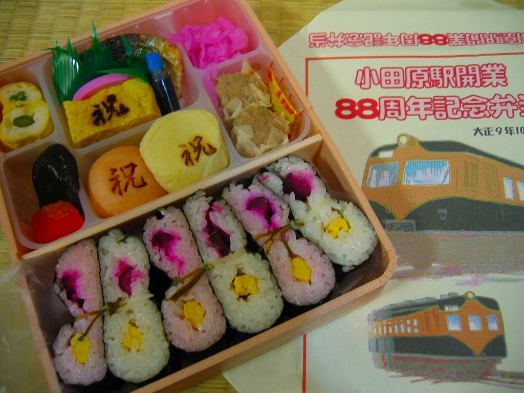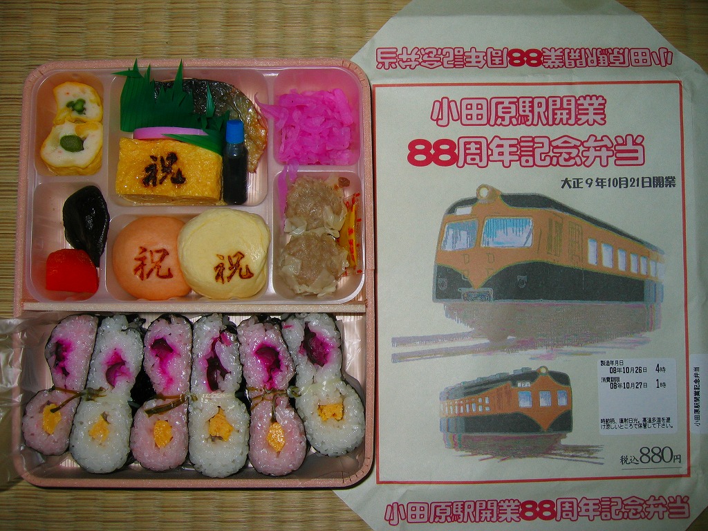 小田原駅の開業88周年を記念して、2008(平成20)年10月に販売。木目調の紙底な容器に経木のふたをかけ、昭和20年代の湘南電車を描いた掛紙をかけて、紅白のひもで十字にしばる。半透明のトレーに入った中身は、玉子の細巻きと柴漬けの細巻き、紅白のまんじゅう、シュウマイ2個、鮭の塩焼き、煮物にカマボコに大根桜漬けなど。