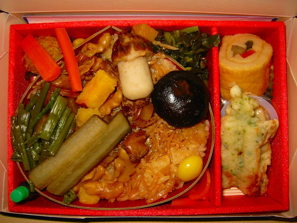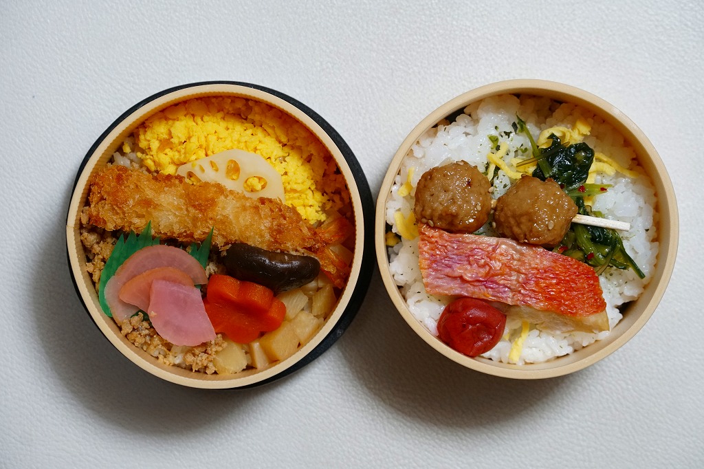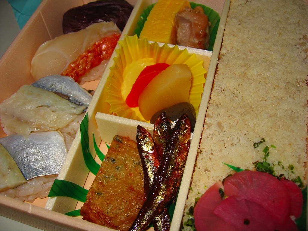 中身は赤と緑のプラ製トレー4個に収まり、錦糸卵やかまぼこや山菜などを載せた御飯、さつま揚げにダイコンやタコやホタテなどの煮物、玉子焼にキンメダイ煮にひじき、タケノコやレンコンなどの煮物。1,200円も取る駅弁なのに、容器にも起因する詰め方の見栄えの悪さがとても気になり、本来は悪くないはずの味を落とした印象。