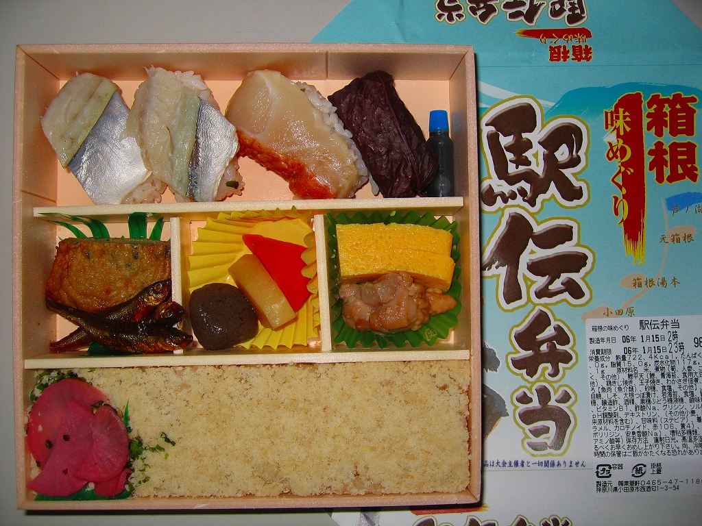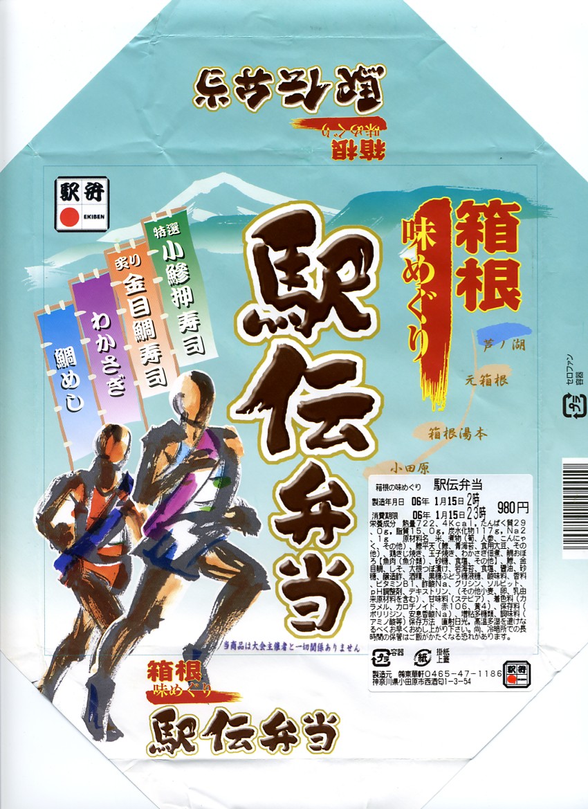 2005(平成17)年10月3日の発売。毎年1月2日と3日に小田原市内を通過する、著名な駅伝大会にあやかったものか。正方形の容器を、弁当名などを書いた大きな掛紙で割りばしごと覆い、紙ひもでしばる。中身はその掛紙にも一部書かれているように、小鯵押寿司2個としそ巻き1個と金目鯛寿司1個に鯛めしという、小田原の名物駅弁のオールスターに、ワカサギや鶏肉や玉子焼や煮物など。