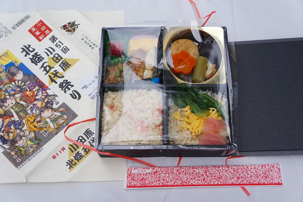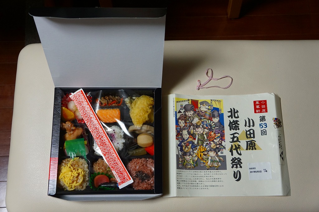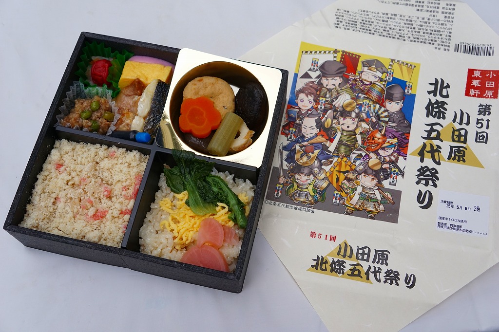 2021(令和3)年5月1日から4日まで小田原駅で販売。ゴールデンウィークと、5月2日から3日までの開催を予定していた第57回小田原北條五代祭りに合わせたものか。その姿はまるで、昭和50年代の小田原駅の名物駅弁「ちょうちん弁当」が復活したように見えた。もとは2020(令和2)年の6月までに、小田急ロマンスカーの車内販売(2021年3月で廃止)で、3日前12時までに予約が必要な弁当として誕生したものらしい。