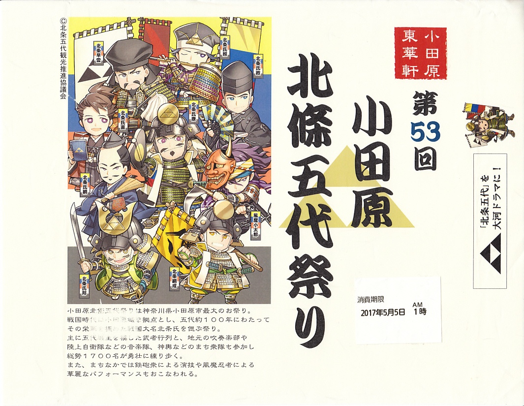 神奈川県小田原市の小田原城の周辺で、毎年5月3日に開催されるお祭り「小田原北條五代祭り」の開催に合わせて、小田原駅でやはり毎年販売される期間限定駅弁の、2017(平成29)年版。掛紙の絵柄と内容は2年前と変わらず、小田原市役所の「北条五代PRキャラクター」の集合イラストを使う。