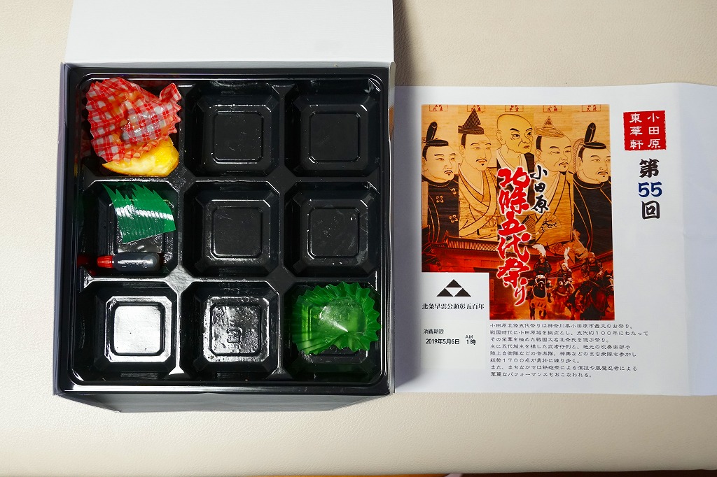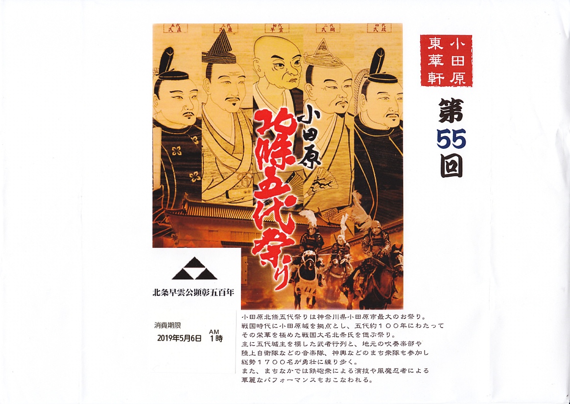 神奈川県小田原市の小田原城の周辺で、毎年5月3日に開催されるお祭り「小田原北條五代祭り」の開催に合わせて、小田原駅でやはり毎年販売される期間限定駅弁の、2019(令和元)年版。掛紙には「北条五代」と総称する、16世紀の室町時代や戦国時代に小田原を統治した北条早雲、北条氏綱、北条氏康、北条氏政、北条氏直の肖像画を並べた。