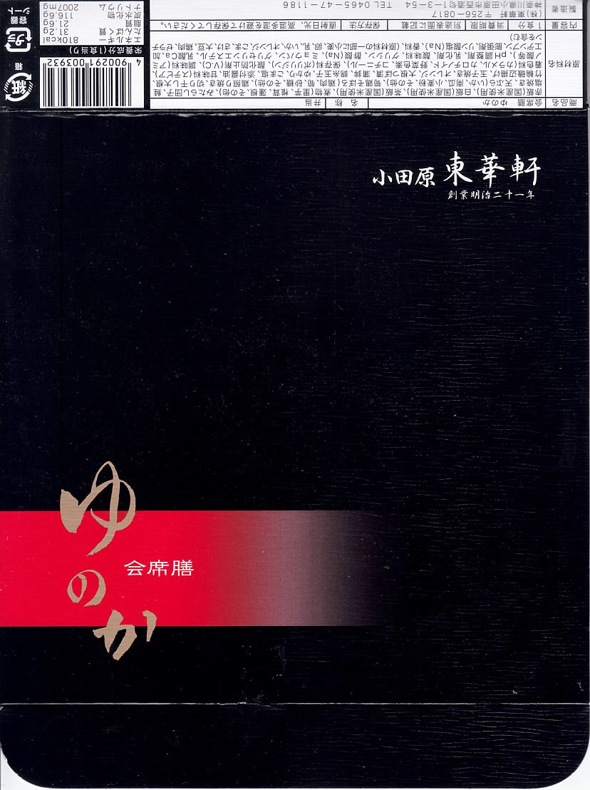 食品表示ラベルに35種類もの食材が記される具だくさん弁当。さすが駅弁屋の弁当で、常温での味が引き立つ。この時期の小田原駅で一週間に17個もの駅弁を購入したが、その中で一番の出来だと感じた。訪問時には小田原駅の橋上自由通路の土産物店で、箱根湯本駅など他の弁当に埋もれる形での販売だった。箱根湯本の土産物店で人気だとか。価格は2004年の購入時で1,000円、2014年4月の消費税率改定で1,030円、2022年時点で1,100円、2023年6月から1,150円、2025年時点で1,200円、おそらく6月から1,300円。