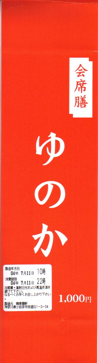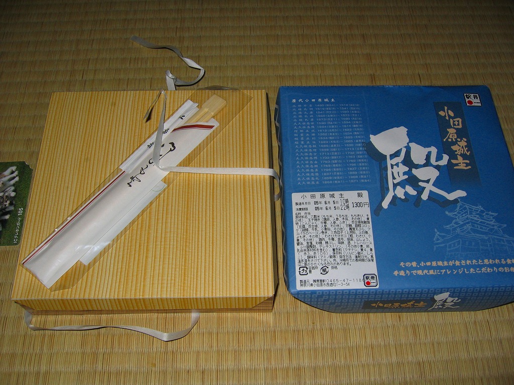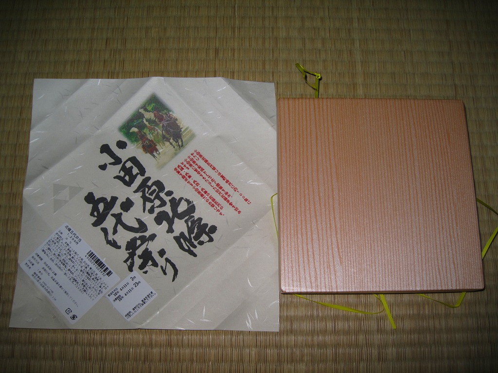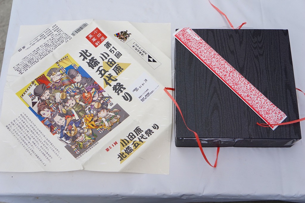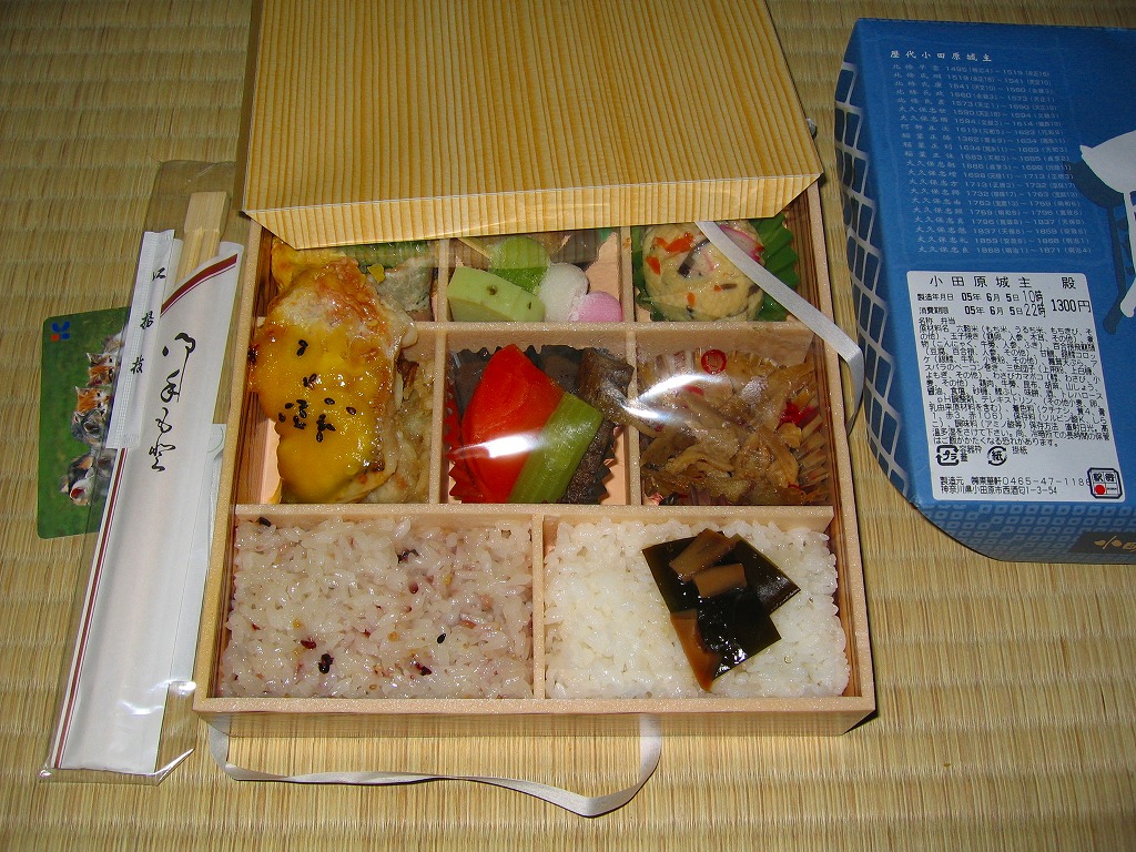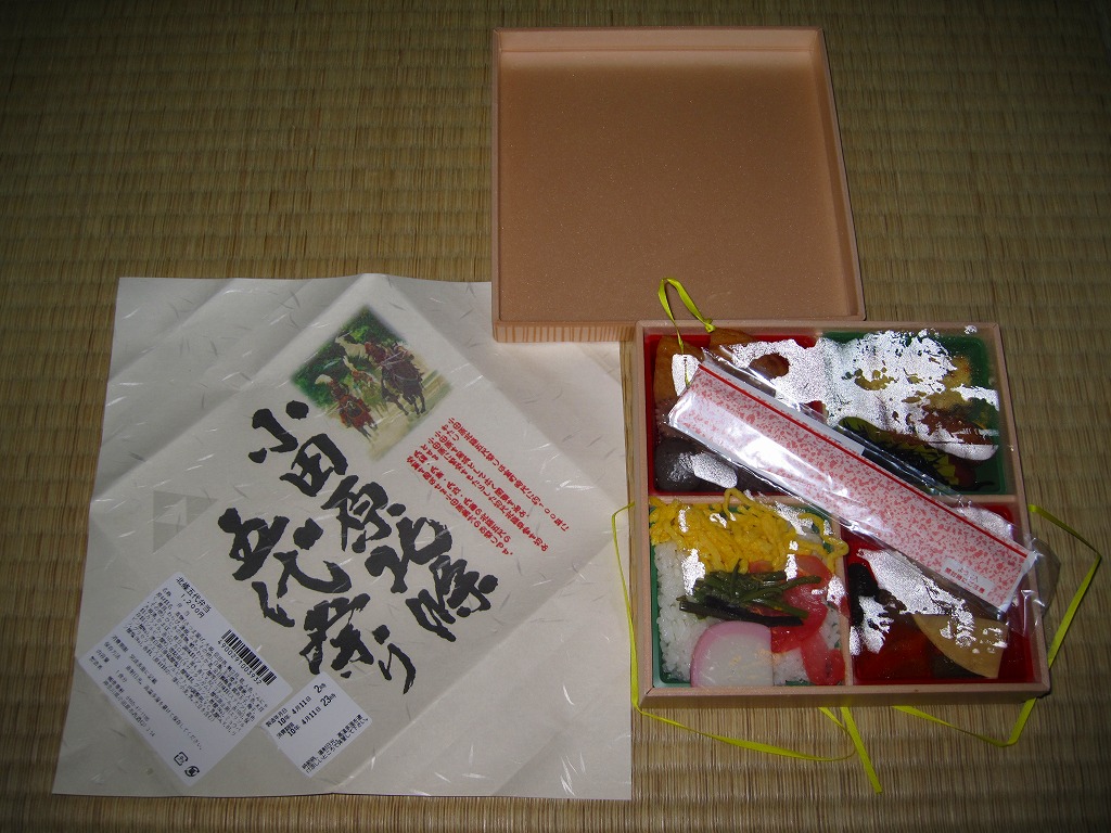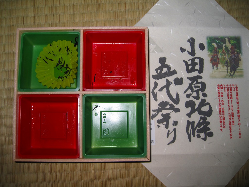 2010(平成22)年4月10日から11日まで東京駅で開催された第11回東日本縦断駅弁大会で販売された記念駅弁。八戸、一ノ関(2種)、仙台(2種)、小田原、米沢(2種)、郡山、直江津、長岡、松本、小淵沢で13種を数えた「戦国・歴史駅弁」のひとつ。小田原駅で販売されたかどうかは分からない。木目柄で正方形の華奢な容器を使用、駅弁の名前イコール小田原でのお祭りの名前とそのイメージを描いた大きな掛紙で包む。