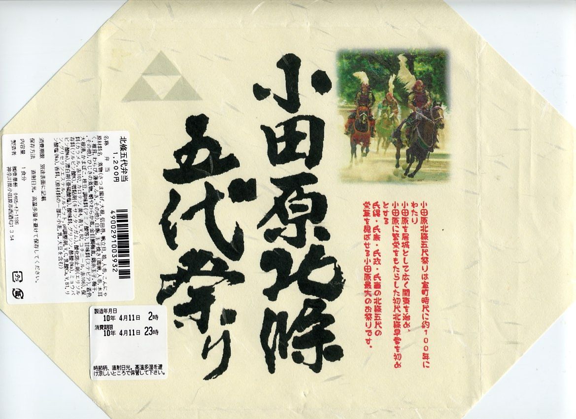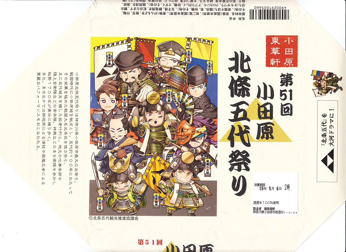 神奈川県小田原市の小田原城の周辺で、毎年5月3日に開催されるお祭り「小田原北條五代祭り」の開催に合わせて、小田原駅でやはり毎年販売される期間限定駅弁。掛紙の絵柄は数年ごとに変わるようで、今回はこの年の4月に小田原市役所から完成が発表された「北条五代PRキャラクター」の集合イラストがそのまま転記されていた。