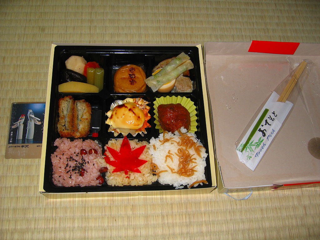市販のボール紙弁当箱にインクジェット印刷の掛紙をかける。中身は日の丸ご飯にサワラ照焼、エビフライ、蒲鉾、玉子焼、豚味噌焼、煮物、金時、野沢菜、お菓子に、小田原駅弁のとりそぼろとシュウマイ。中身を書けば豊富に聞こえて、その見栄えや風味や分量は480円の惣菜レベル。外観も含めてNREや秩父鉄道の同種駅弁と比べるのがかわいそうな出来で、わざわざメガターミナルで復刻販売しないほうがよかったかもしれない。