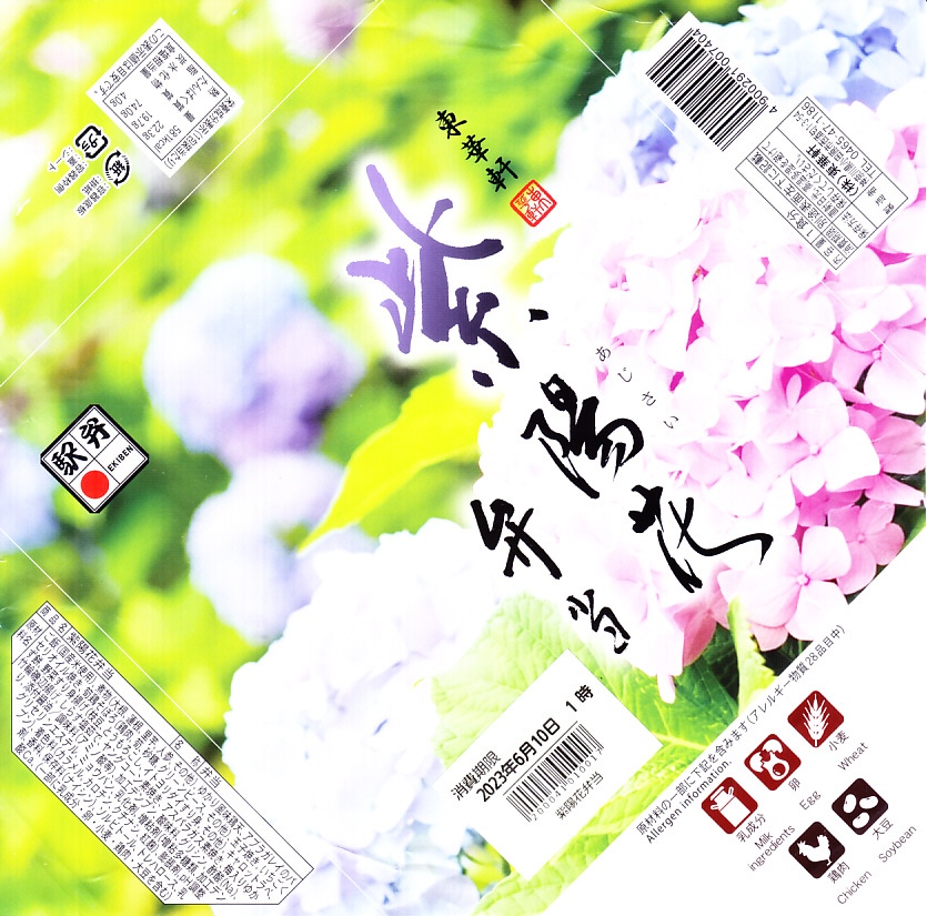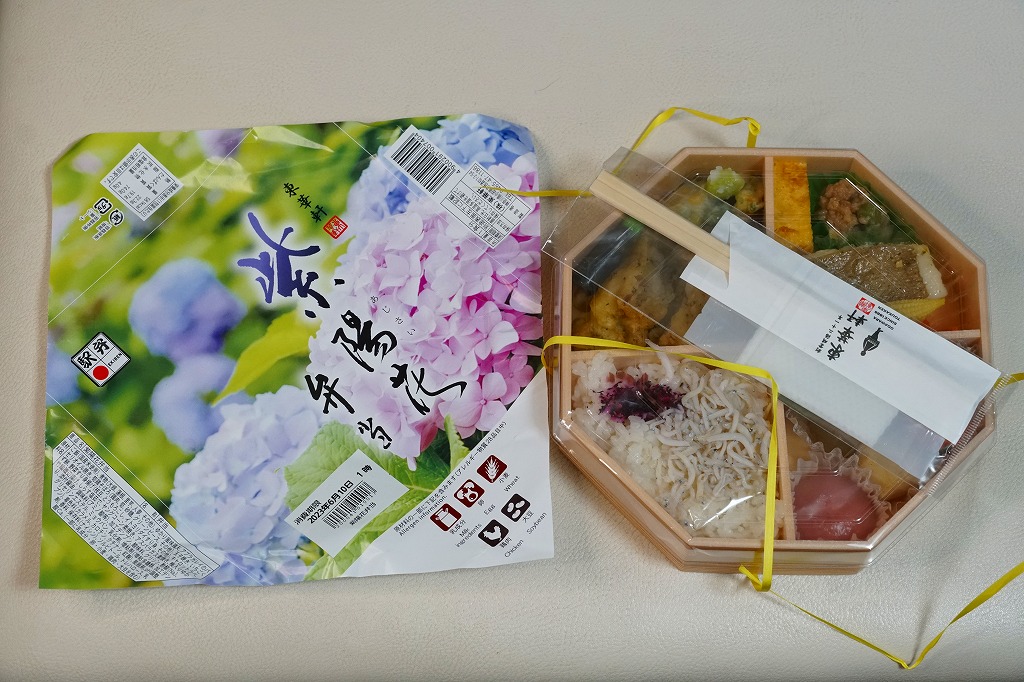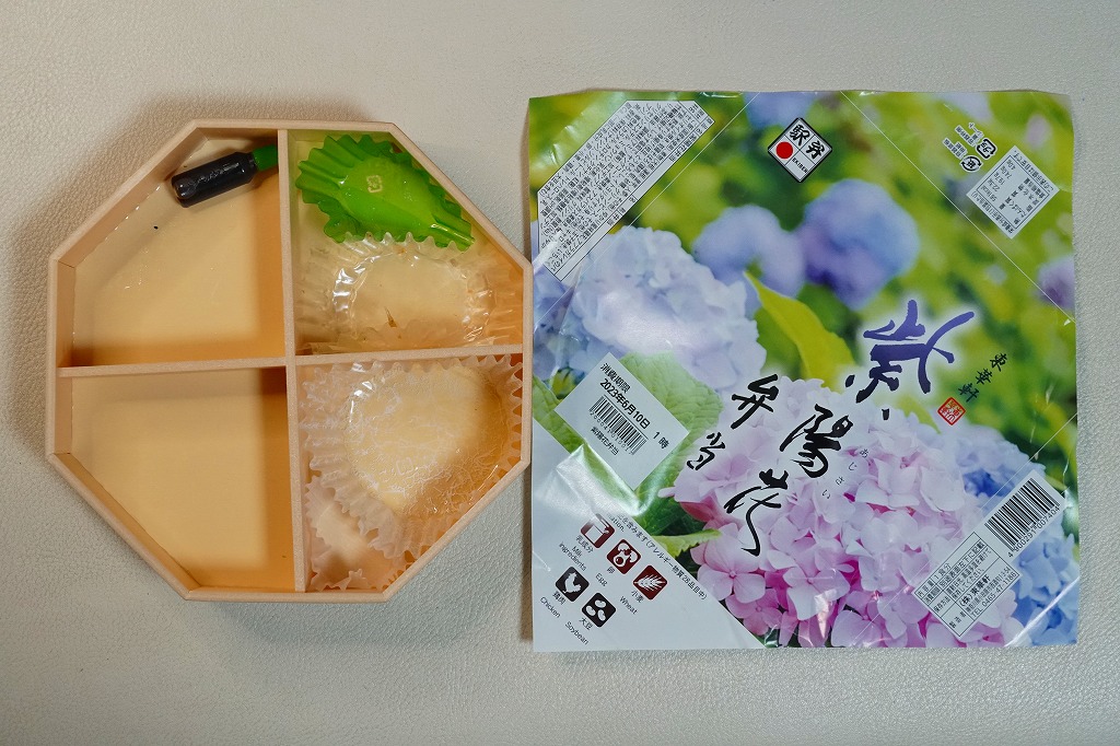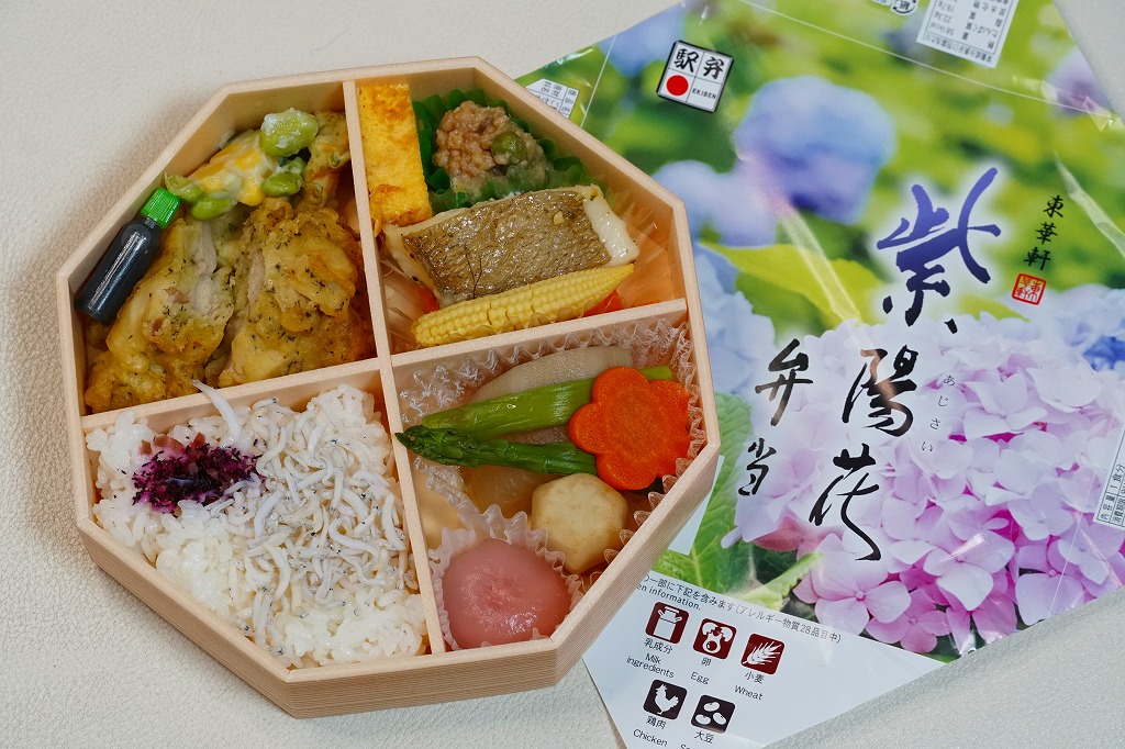 この名前の小田原駅弁は、2012年、2017年、2018年、2021年の6月やその前後に売られたようだ。今回の2023(令和5)年は、5月中旬から7月10日まで売られた、夏の駅弁。掛紙の絵柄は駅弁の名前のとおり、紫陽花(あじさい)でできている。正八角形の容器を4分割した今回の中身は、梅入りゆかり御飯、ゆかり風味鶏天と野菜すり身揚げと竹輪磯辺揚げ、玉子焼と焼き魚とヤングコーンととりそぼろ、大根や蓮根などの煮物といちごくず餅。調製元は小田原駅弁の東華軒で、小田原駅でも買えると思うが、主に東京駅や新宿駅など東京の駅弁売店で売られるものだと思う。2024年は5月7日から7月10日まで販売した模様。