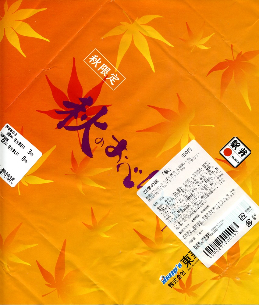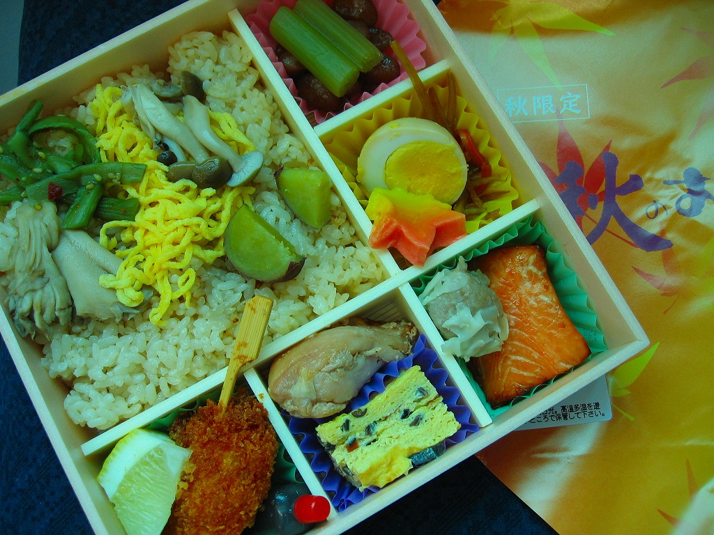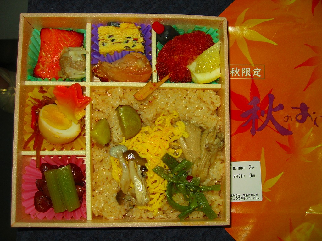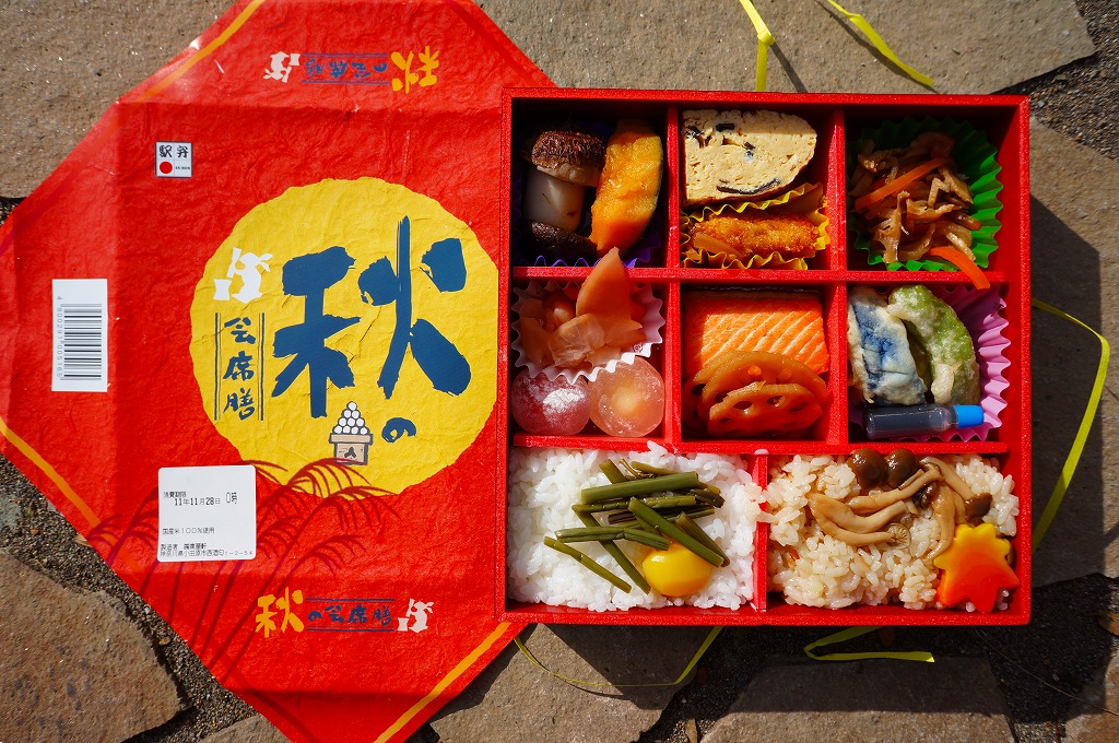 小田原駅の秋限定の駅弁。「季節のおべんとう春」とまったく同じ、正方形の容器に枯葉色の掛紙をかけて、ピンク色の紙ひもでしばる。中身はきのこの混ぜ御飯に、茄子肉詰フライ・牛肉ゴボウの甘辛煮・里芋などの煮物・銀杏などと、玉子そうめんで秋色の衣を付けた里芋煮。おかずの分量が御飯と比較して少なく見えて、飯だけで食が進み逆におかずを余してしまった。