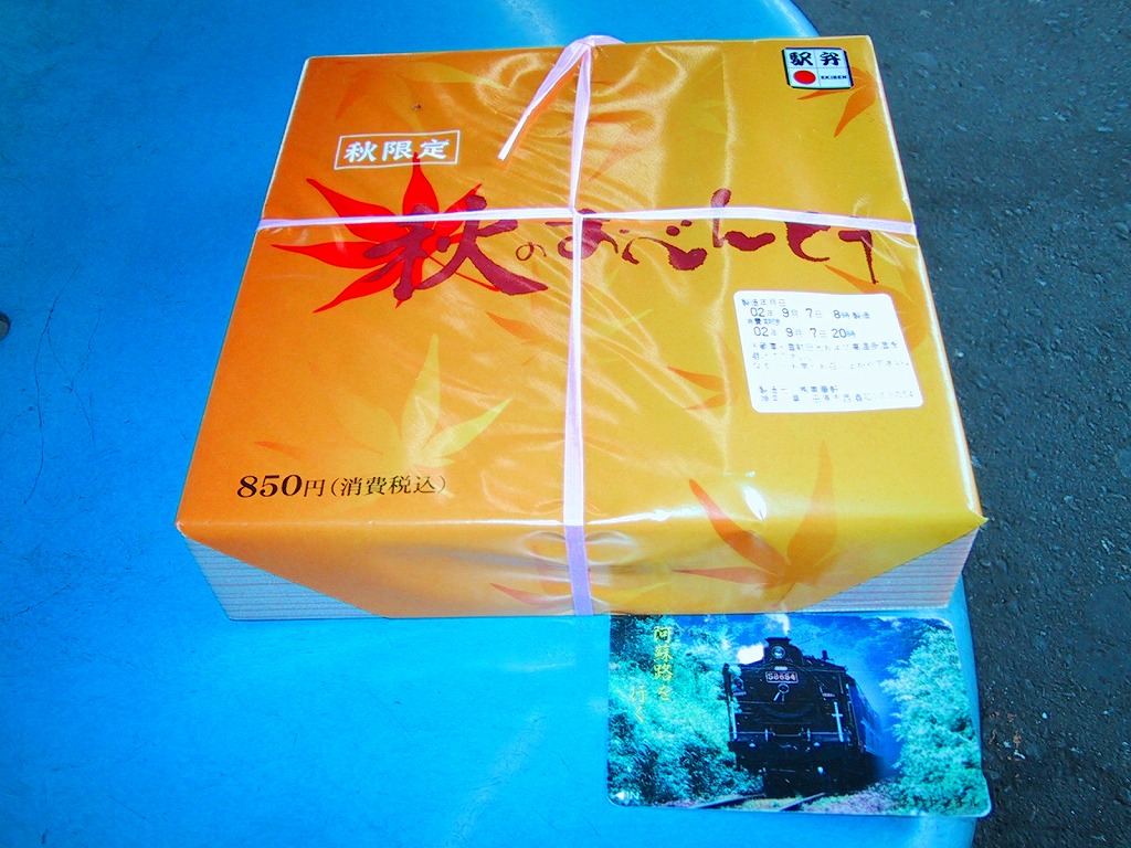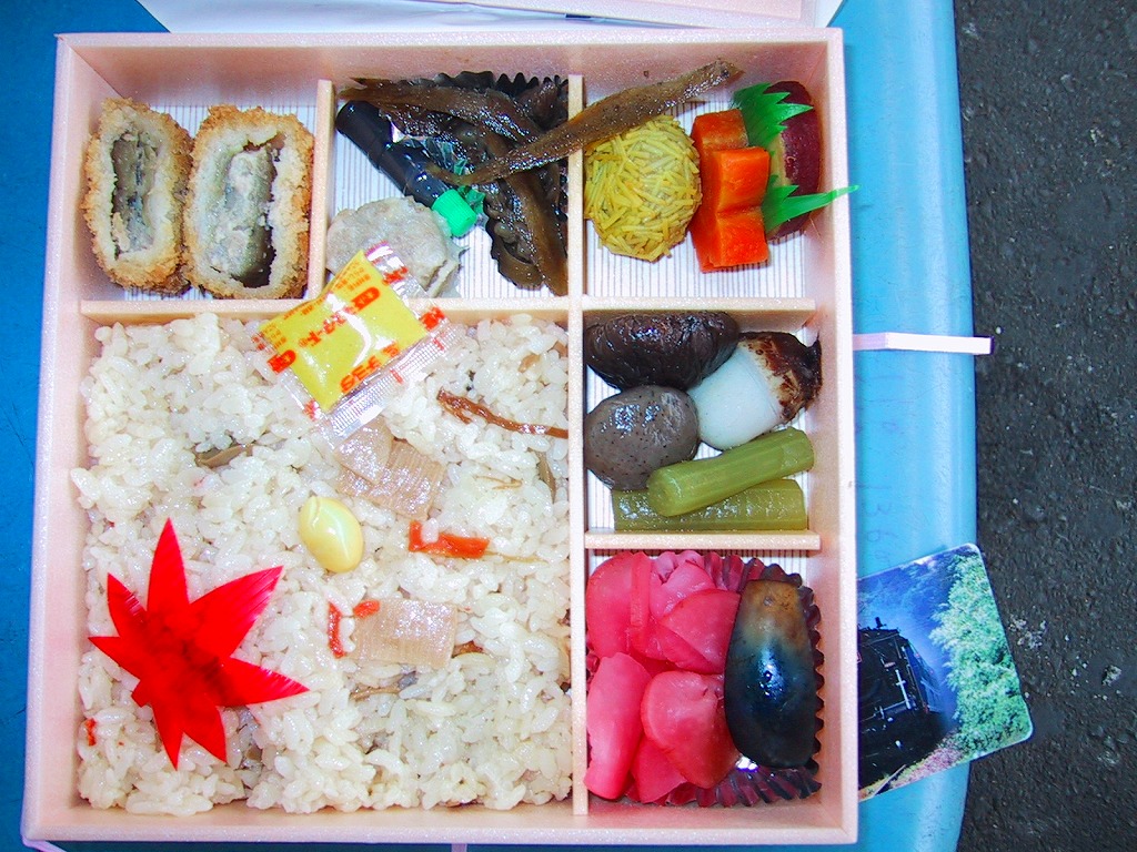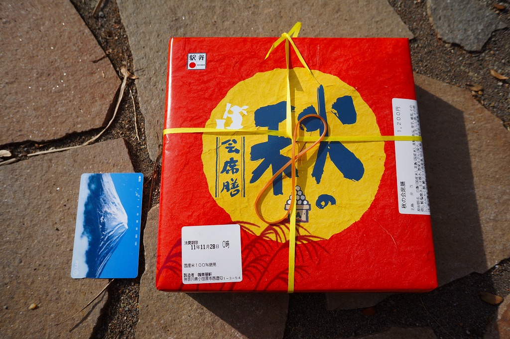 小田原駅の秋駅弁の、2011(平成23)年時点での姿。3年前のものと比べて価格と名前も含めて似て非なる感じ。今回の中身は山菜載せ御飯とシメジ載せ茶飯、サケ塩焼、ナスやシシトウなどの揚げ物、玉子焼、カボチャやサトイモなどの煮物、アジフライ、きんぴらごぼう、こんにゃくもちなど。様々な顔を持つ小田原駅弁のうち、良い表情のほうが出ていた。現在は、この名前と価格と姿では売られていない模様。