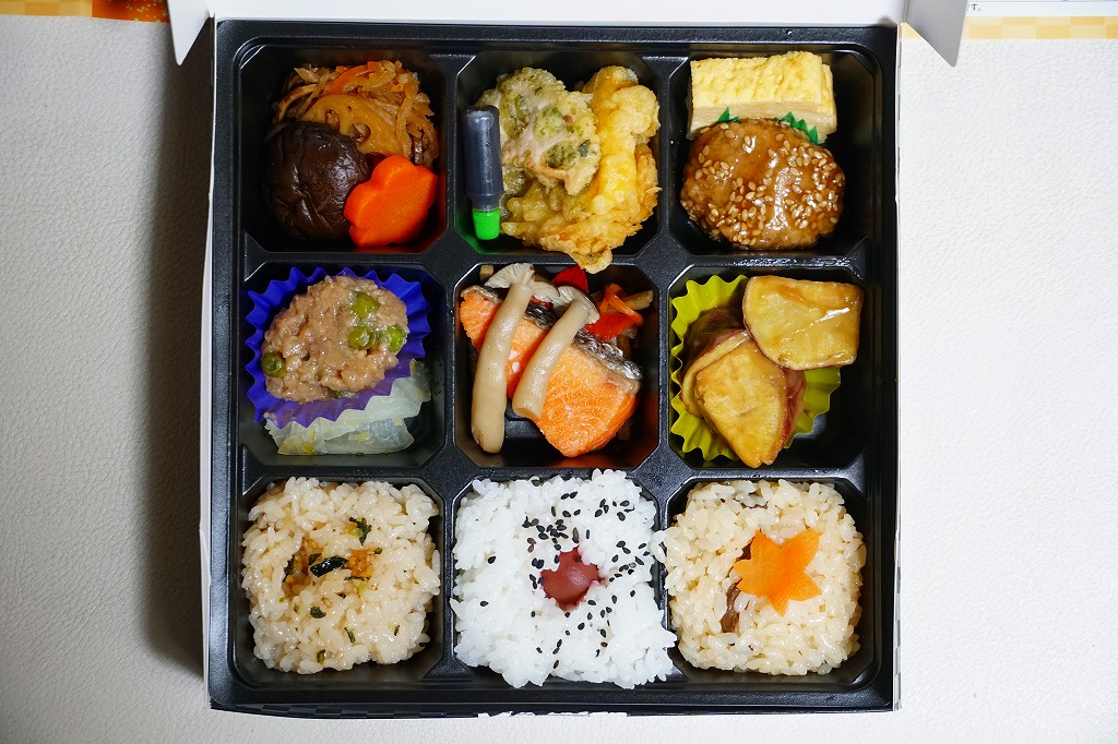 仕出し弁当向けの黒い紙箱に、春の色と文字と絵柄を持つ掛紙を巻く。「六種のおかずと三種のご飯」を名乗る、プラ製トレーによる9区画の中身は、日の丸御飯、たけのこ御飯、玉子そぼろ御飯、小田原駅弁のとりそぼろと玉子焼、甘鯛の塩焼き、タケノコの土佐煮と大根の漬物、切り干し大根とシイタケやレンコンやニンジンの煮物、たけのこと海老の天ぷら、鶏唐揚にみぶ菜とわさびの醤油漬。タケノコは小田原駅弁では通年のものなので、中身はオールシーズンで使えそう。