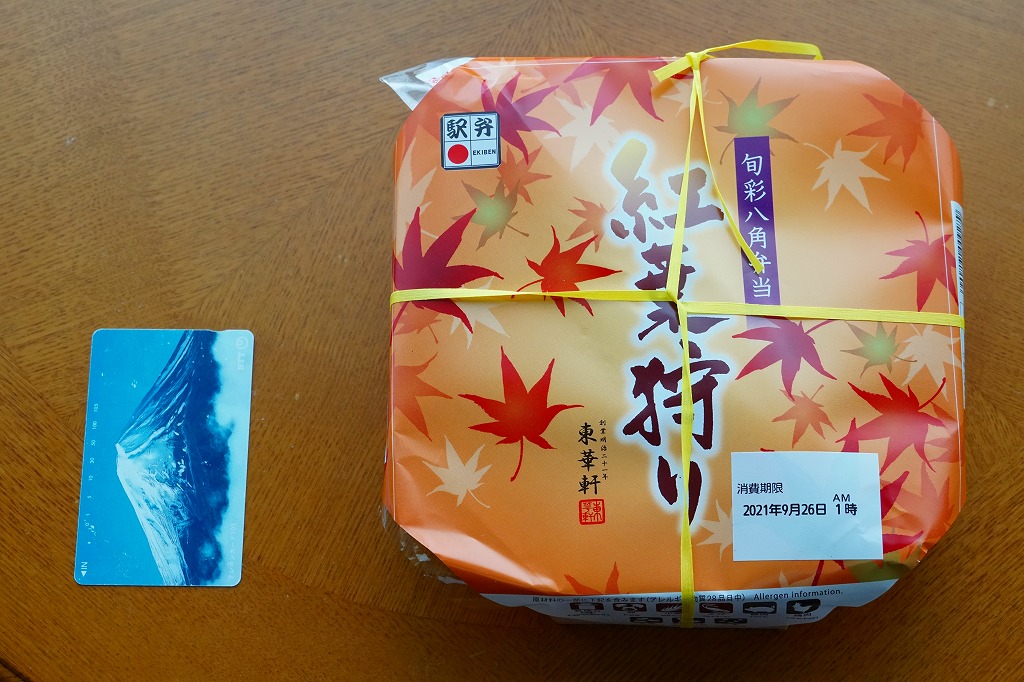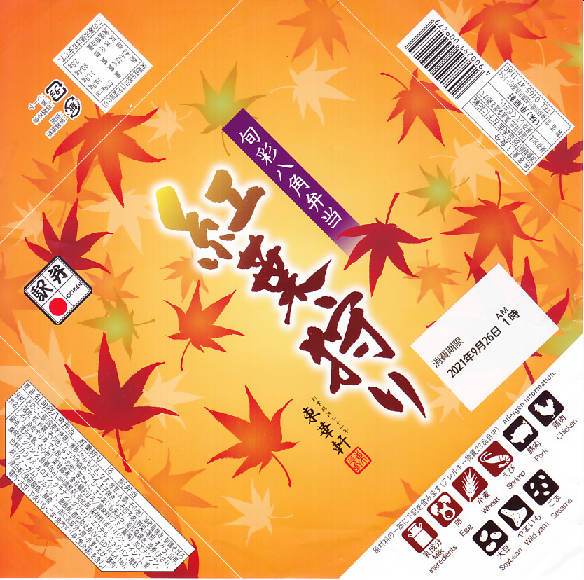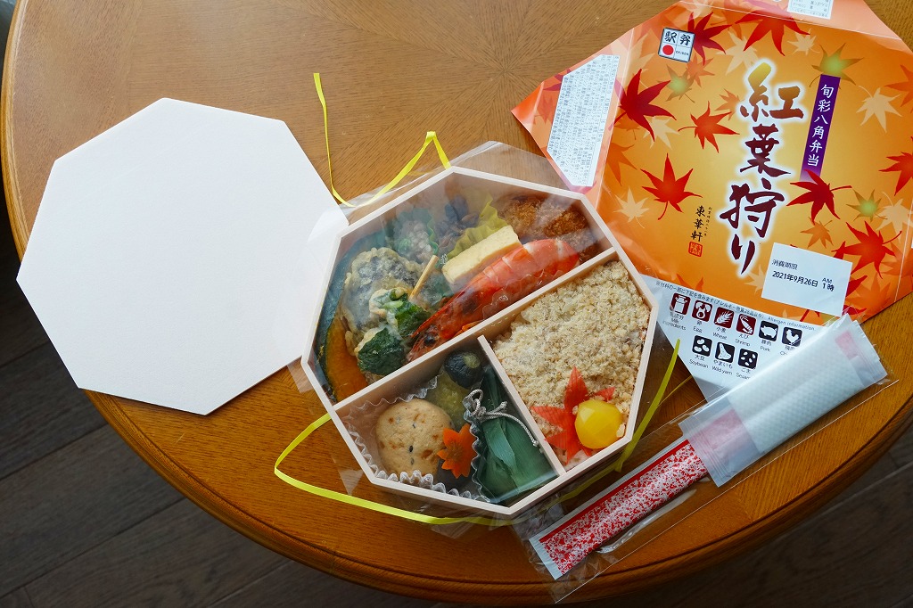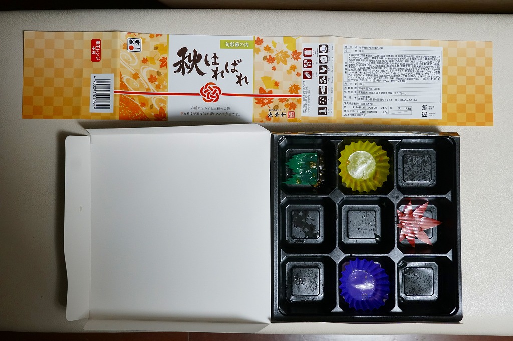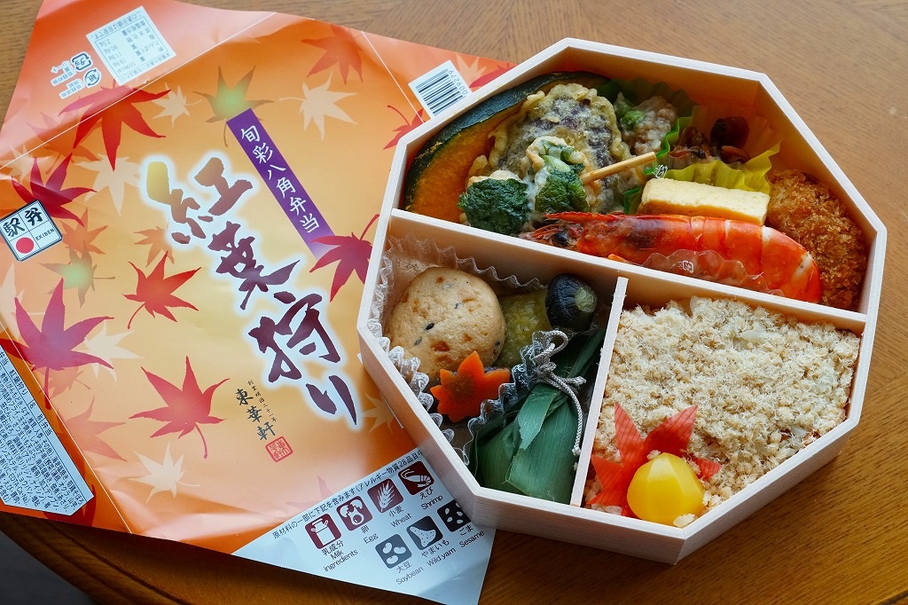 2019(令和元)年の秋に発売か。東京の新宿駅で購入したが、見栄えと名前と調製元から、これはきっと小田原駅の秋駅弁だろう。正八角形の容器を包む正方形の掛紙は、名前どおりの紅葉色。中身は鯛飯に栗を添え、ナスやがんもどきなどの煮物に笹団子を添え、有頭海老、ナスの肉詰めフライ、かぼちゃ、サツマイモの天ぷら、しそ団子串、アサリ佃煮など。高級になった秋のお弁当。2020年までは鯛飯でなくきのこ御飯を詰めたらしい。価格は2019年の発売時で1,100円、2020年秋は1,180円、2021年は販売なしか、2022年秋は1,250円、2023年秋は1,300円、2024年も9月から11月まで販売。