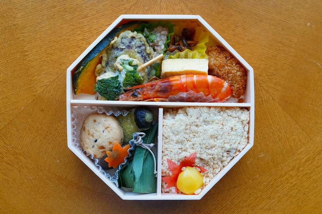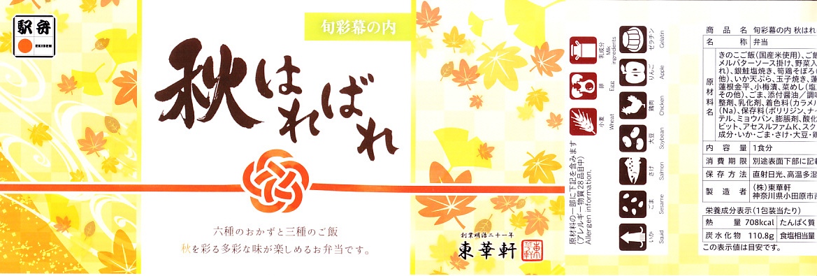2024(令和6)年10月1日から11月末まで、小田原駅や熱海駅に東京駅などで販売。同月のJR東日本の駅弁キャンペーン「駅弁味の陣2024」にエントリー。紅葉の掛紙を締めた市松模様の市販容器の9区画に、きのこご飯と日の丸御飯とふりかけ茶飯で3種の御飯と、さつまいも揚げ、銀鮭の塩焼きときんぴらごぼう、とりそぼろとゆず大根漬、鶏つくねと玉子焼、いかとカボチャの天ぷらにれんこんの磯辺揚げ、煮物と切り干し大根、きんぴられんこんの6区画。とりそぼろで小田原駅弁だとわかる、秋のおつまみ弁当。
