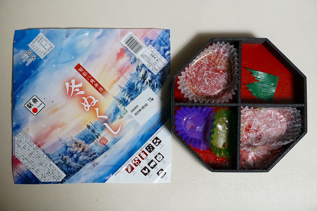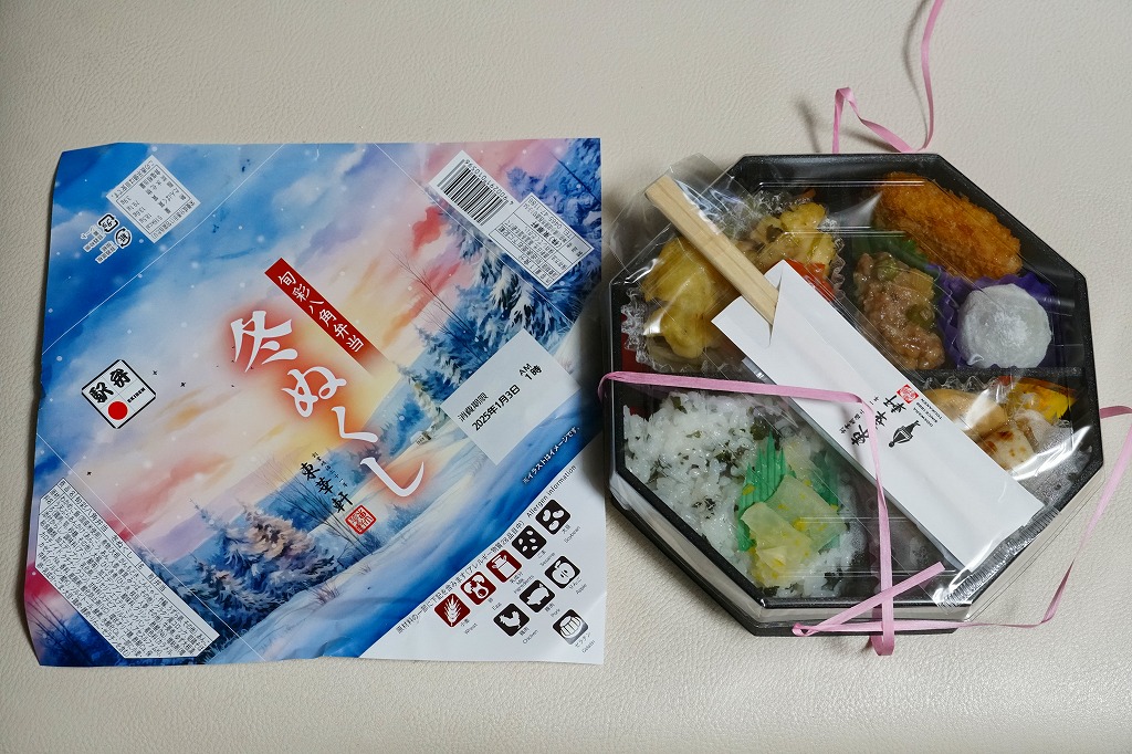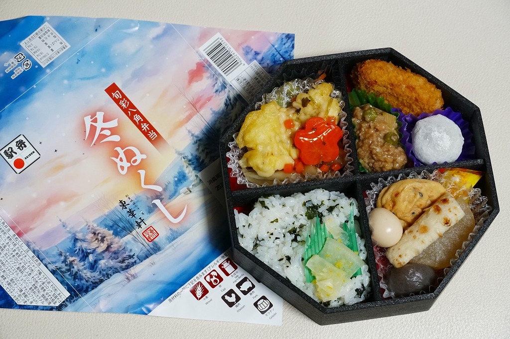 2023(令和5)年12月に小田原駅などで発売。12月から1月まで販売される冬季の駅弁。駅弁の名前どおりの黒い正八角形の容器を、小田原では見られない豪雪な冬景色の掛紙で包む。4区画の中身は、わかめご飯とゆず大根漬、おでんをイメージした煮物、あんこうの天ぷらあんかけとひじき煮とごぼう煮、とりそぼろとグラタン風コロッケとミニ大福。冬らしく感じると思う食材がみずみずしい。