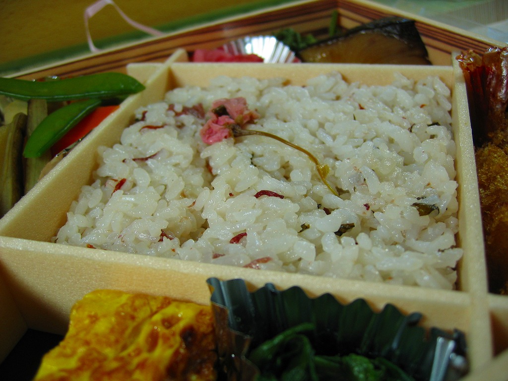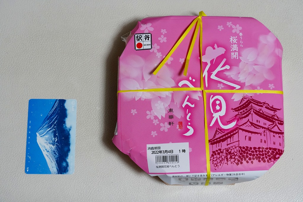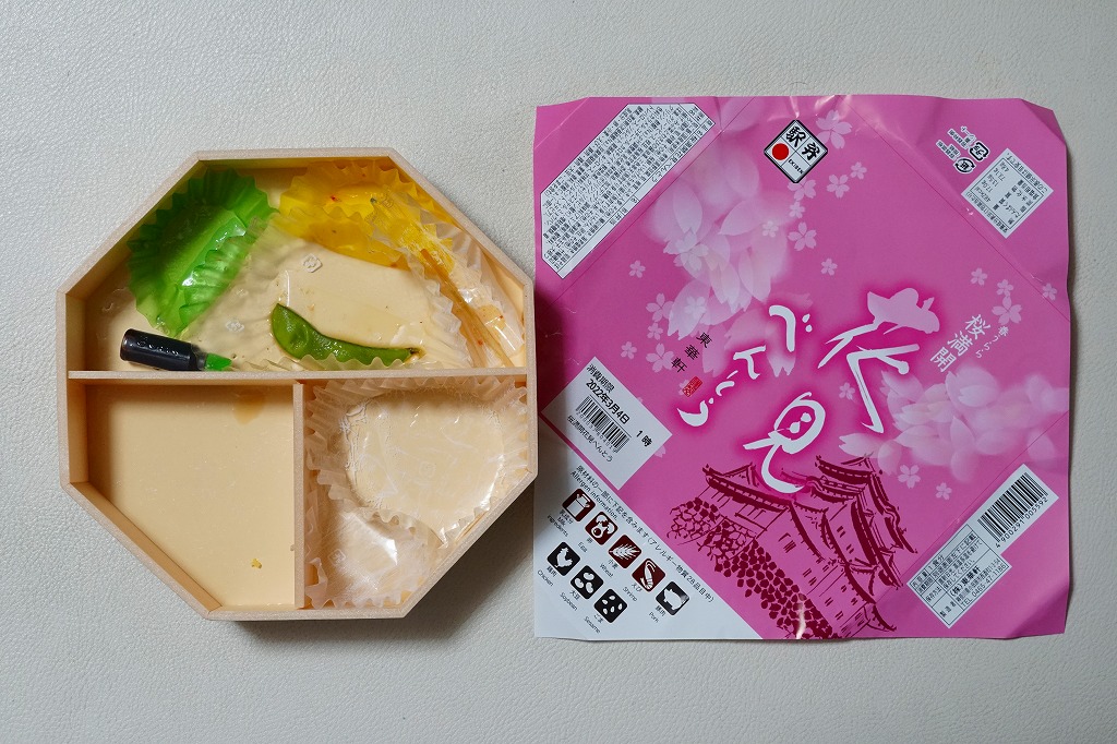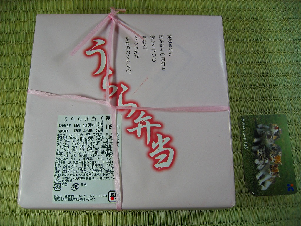 小田原駅の春駅弁の、2005(平成17)年版。木目調正方形の容器に木目印刷の紙のふたをして、これを春色の掛紙で包んで桜色の紙ひもでしばる。中身は井形の仕切りの中央に桜御飯を詰め、その周囲にブリと菜の花、里芋などの煮物、玉子焼やエビフライなどを配置する。従来の季節駅弁より200円高いが、おかずの見栄えと分量と品質がそれ以上は向上し、しかし大きな食品表示ラベルで見栄えを落としている。