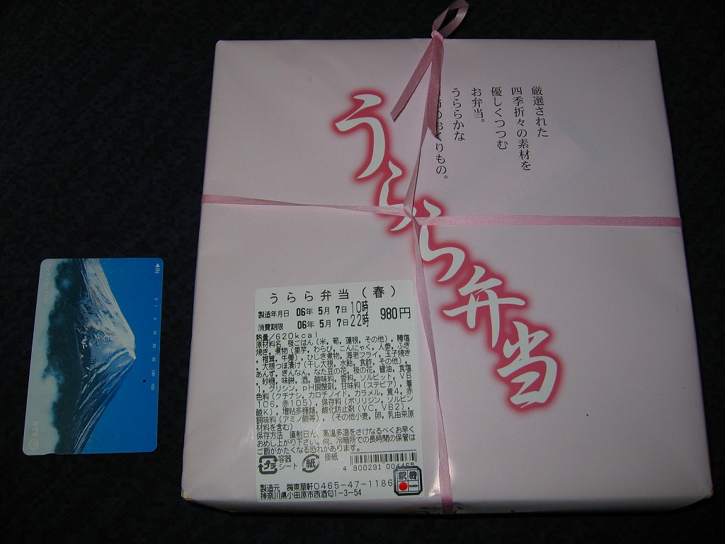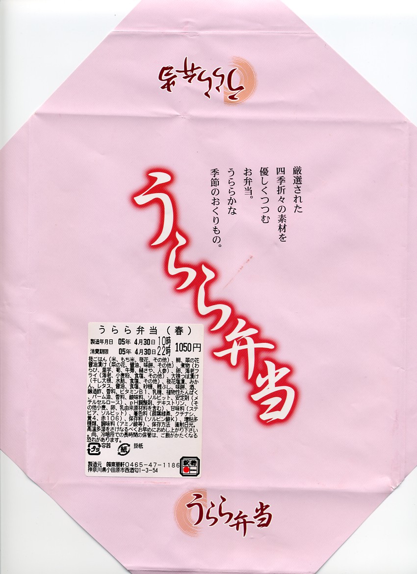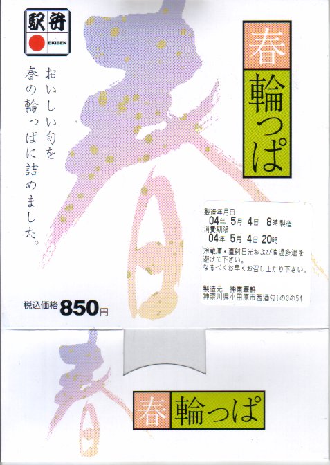 小田原駅の春駅弁の、2006(平成18)年版。前年と比べて容器や掛紙は同じで、中身も間違い探しの範囲でしか異ならないが、なぜか値段は70円下がり、3桁に抑えられた。駅弁マークが掛紙ではなく食品表示ラベルに載るのは引き続きユニーク。小田原駅の橋上化後長らく、改札内コンコースでの駅弁販売は屋台だったが、今回訪問したら改札脇に立派な売店ができており、びっくりした。