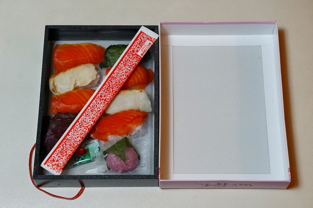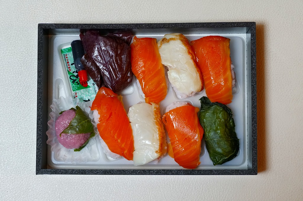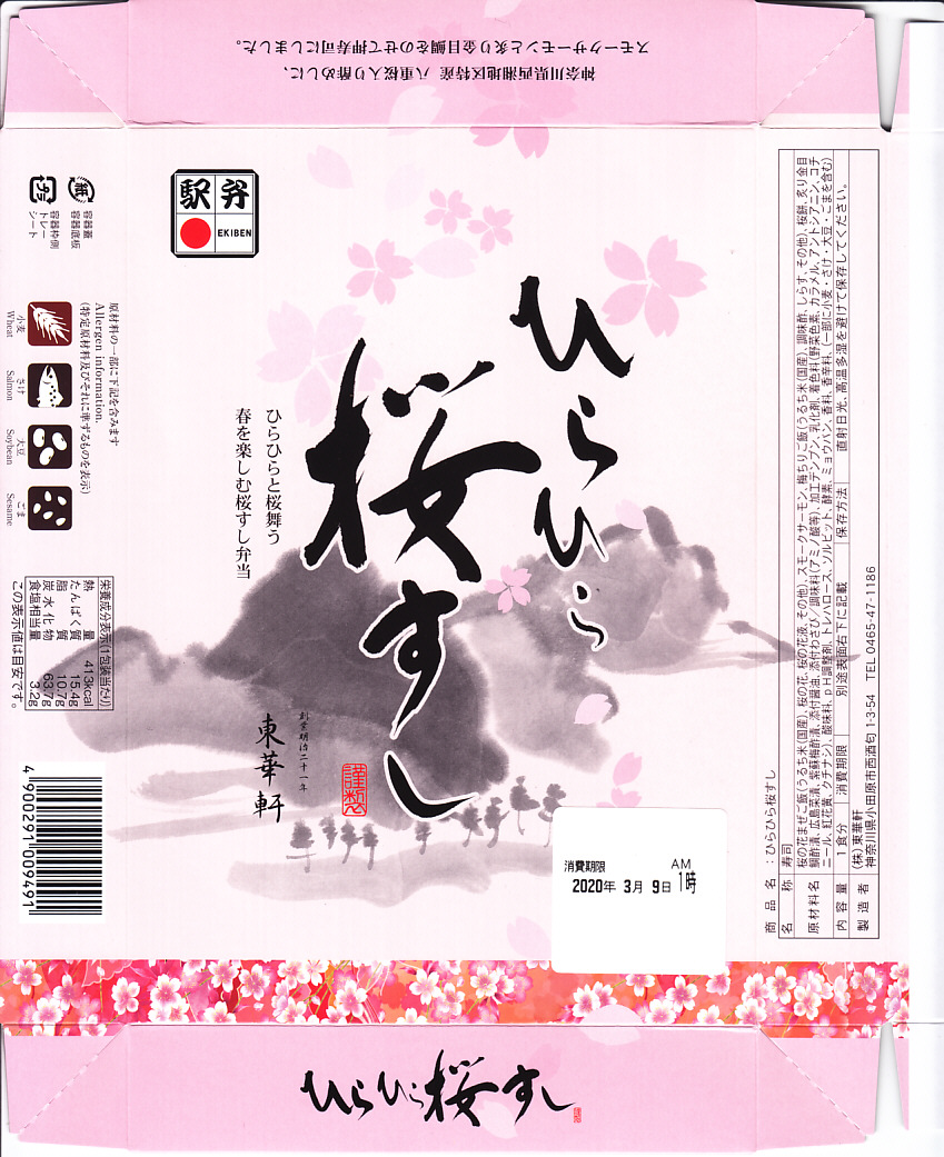 2013(平成25)年頃の発売か。春季限定の駅弁と思われる。小田原駅で伝統の駅弁「小鯵押寿司」と同じ構造の容器に、小鯵押寿司と同じような大きさで、サーモン4個、炙り金目鯛2個、高菜巻1個、しそ巻1個の押寿司と、桜餅1個を並べる。不思議と紹介例や収穫報告がほとんどない、幻のような駅弁。酸っぱい要素がないので食べやすい。2021年までの販売か。
