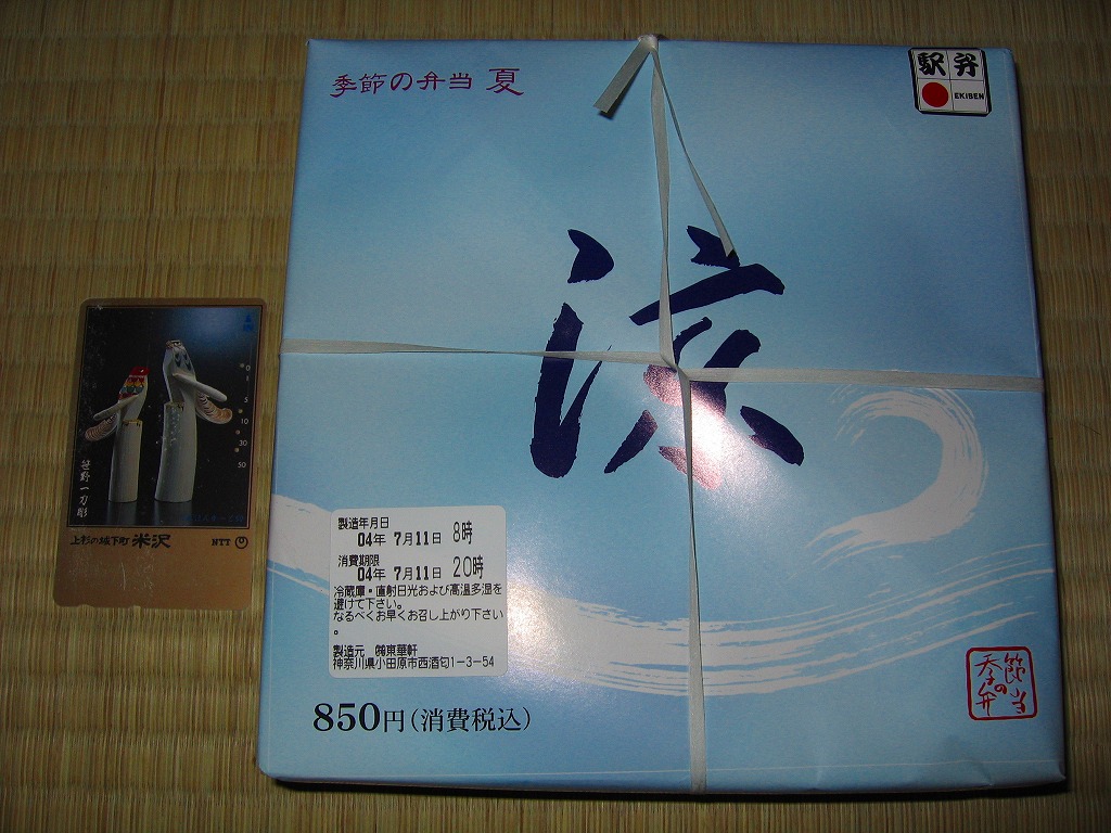 小田原駅の夏限定の駅弁。正方形の容器に空色の掛紙をかけて雲色の紙ひもでしばる、外見だけで夏いっぱいの駅弁。中身は2004(平成16)年版で、ミョウガが載った梅じゃこ御飯に海鮮団子揚やオクラ磯辺巻揚や鯵干物マリネや煮物に大根や胡瓜の漬物など。