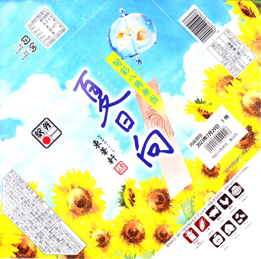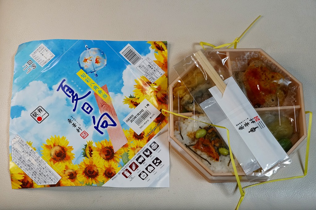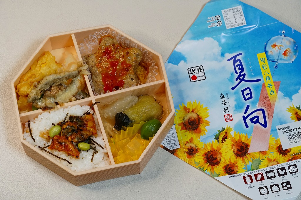 この名前の小田原駅弁は、2023(令和5)年7月11日に初めて発売か。8月まで販売する、夏の駅弁。掛紙の絵柄は青い空とヒマワリと風鈴で、夏真っ盛り。正八角形の容器を4分割した中身は、うなぎごはん、とうもろこしの天ぷらと姫鮎の竜田揚げとゆず大根と冬瓜のそぼろあんかけ、トマトソースがけ星型ハンバーグと焼きそばと皮つきフライドポテト、焼き小茄子の煮物と若桃の甘露煮の寒天添え。調製元は「夏の賑やかで華やかな雰囲気をテーマとして、旬の食材や夏を感じさせる食材を盛り込んだお弁当」としたが、そう思えたかどうか。おかずがしっかしりたお弁当。2024年は7月11日から8月31日まで販売。