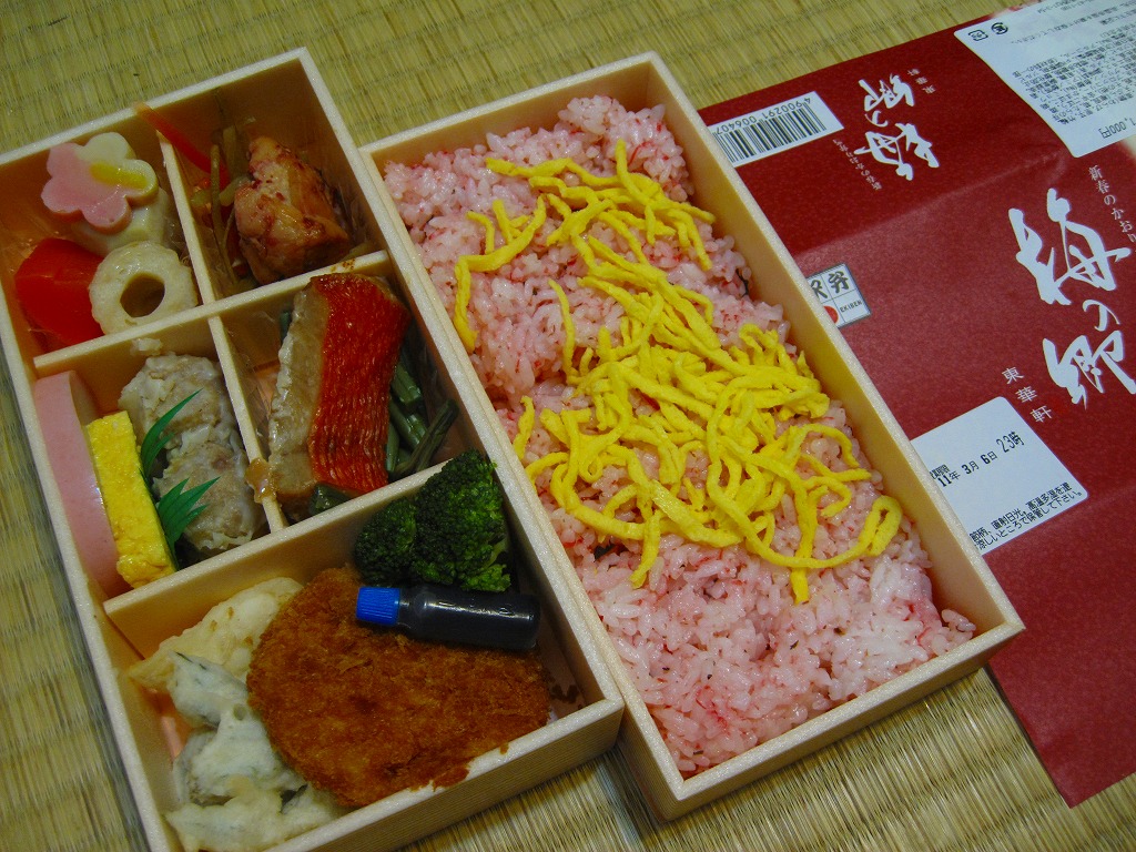 2011(平成23)年2月に発売か。長方形の容器を2段重ねて、木目柄のボール紙でふたをして、梅花を描いた梅色の掛紙で包む。中身は下段が梅御飯、上段がおかずでキンメダイ照焼、かに風味コロッケ、タラノメやタケノコなどのかき揚げ、鶏の梅焼き、サトイモやニンジンなどの煮物、かまぼこと玉子焼、シュウマイ2個など。少々のチープ感があり、下段は梅干し嫌いでも問題なく食べられるほど梅の風味が薄いものであるが、花見の弁当にできそうな分量と彩りと風味があった。2014年にも売られたようだが、おそらく現存しない。