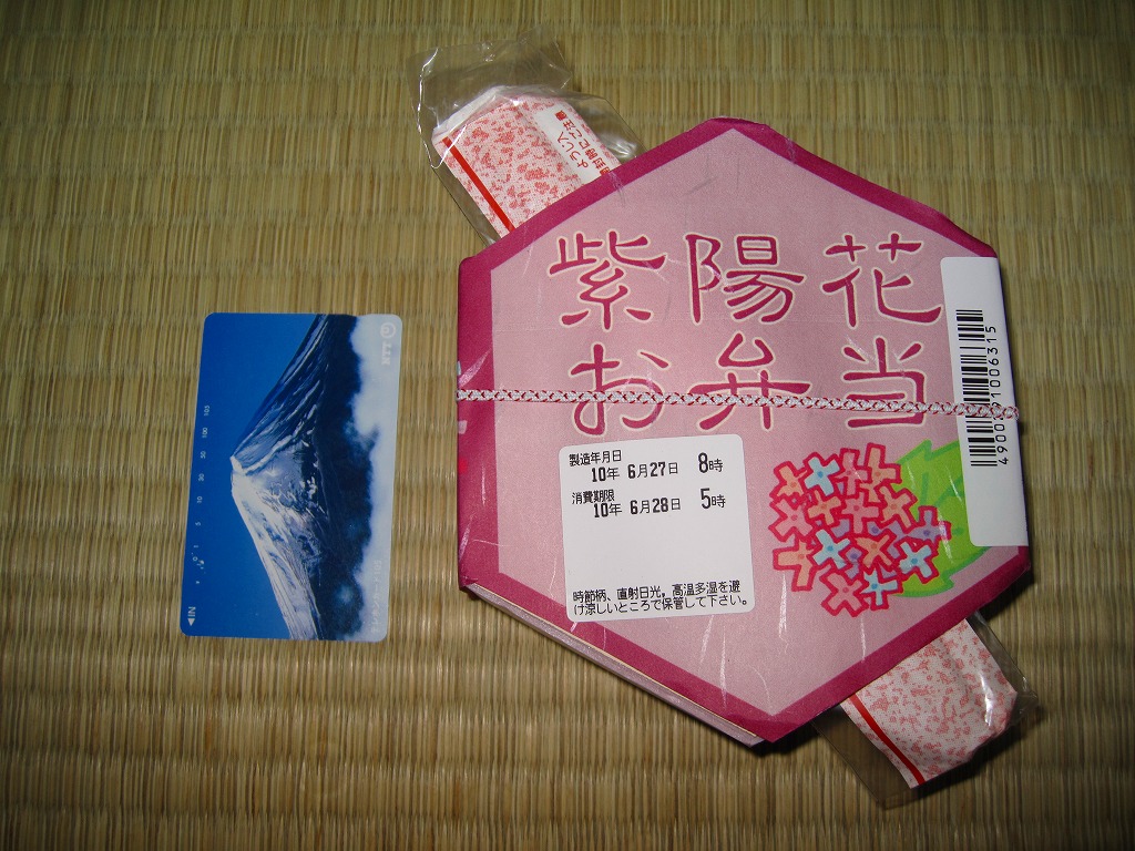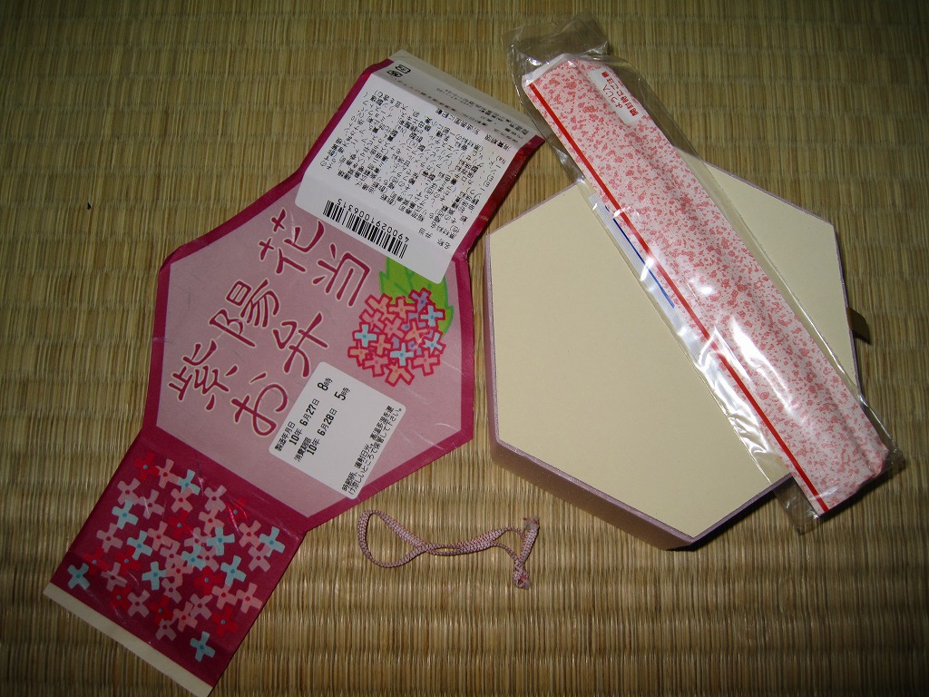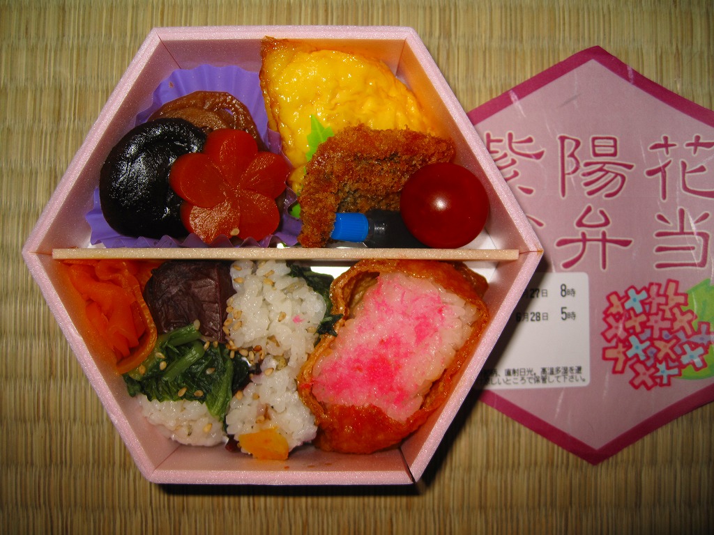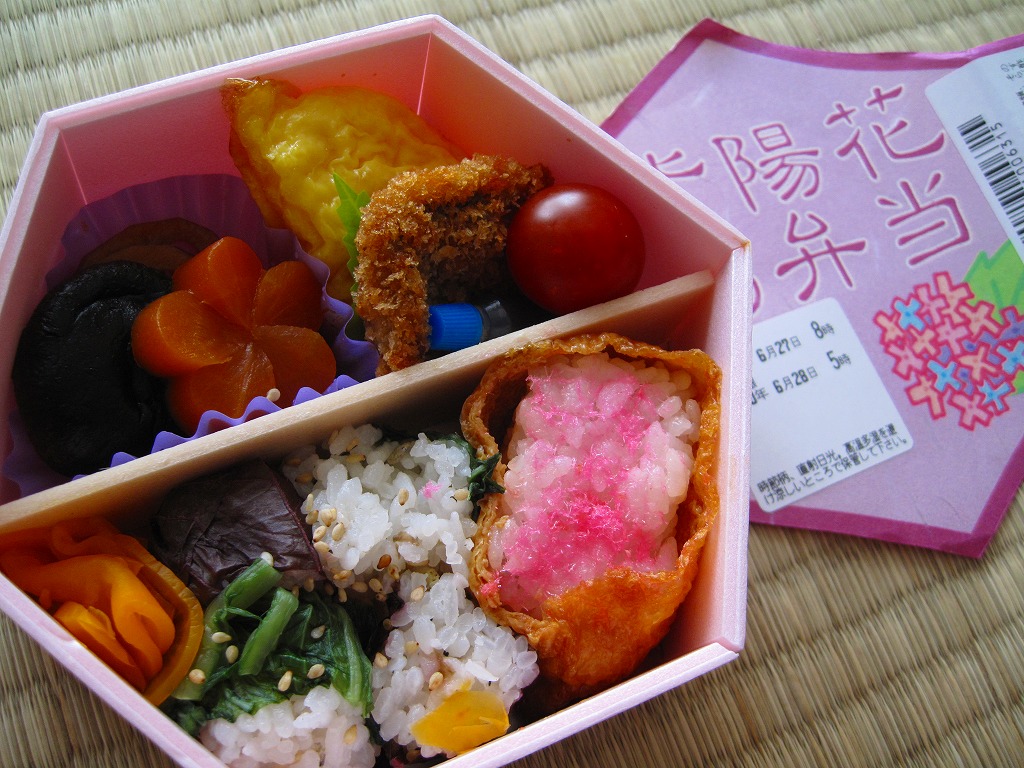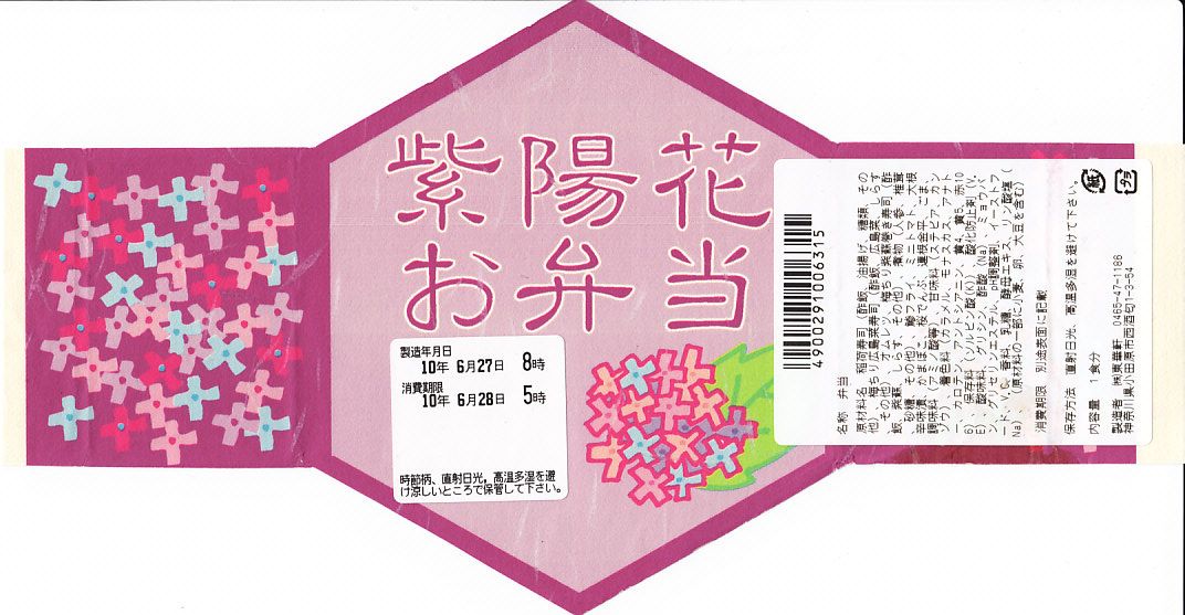 2010(平成22)年と翌年の、あじさいシーズンにのみ販売か。かつて小田原駅弁「小田原城主 姫」に使われた正六角形の容器を使用、中身は桜でんぶを振ったおいなりさん、広島菜やシソの巻寿司、オムレツ、アジフライ、レンコンやシイタケなどの煮物、ミニトマト。分量はとても少ないけれども、彩りの美しい小箱。