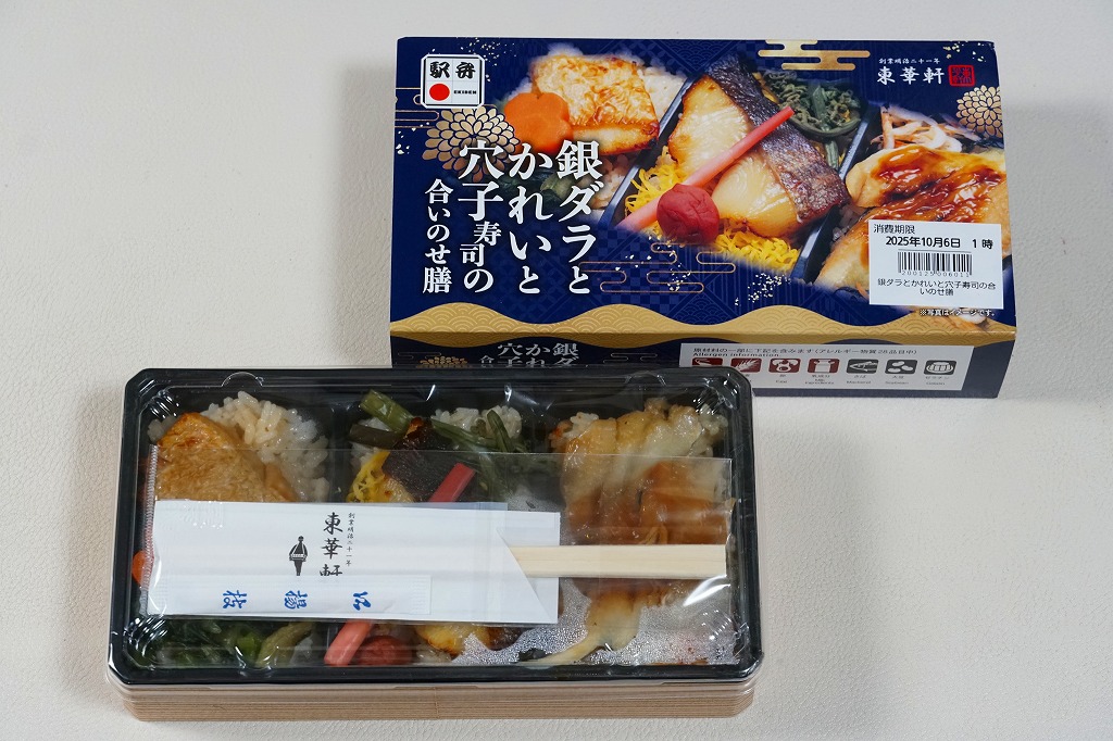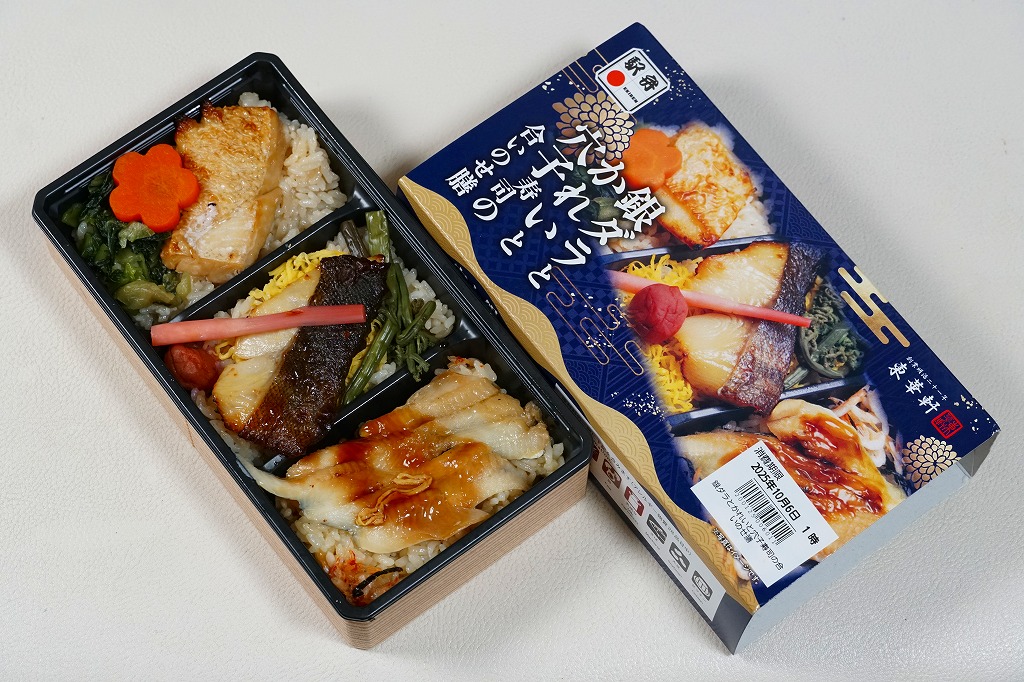 2025(令和7)年9月1日に小田原駅などで発売、10月からのJR東日本の駅弁キャンペーン「駅弁味の陣2025」にエントリー。商品名がほぼ同じである3年前や5年前のものと同じように、容器の3区画に茶飯や赤酢の酢飯を詰めて、銀ダラ西京焼き、アブラガレイ照焼、煮穴子などを載せたもの。焼魚や煮魚の風味をひとつの弁当で3種類、おいしく手軽に味わえる機能も今までのとおり。駅弁に郷土の特産や料理が必要であるという考えにこだわらなければ、常温や冷蔵で売られるここのお魚の駅弁は味で優れていると思う。