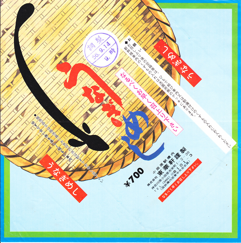 1981(昭和56)年9月14日9時の調製と思われる、昔の小田原駅弁の掛紙。昭和時代は全国各地で、東海道本線や東海道新幹線の駅や車内では特に、ウナギの駅弁が盛んに売られ、人気を得ていた。