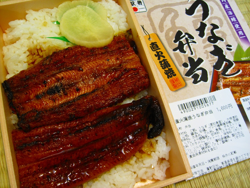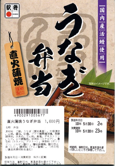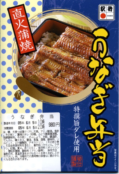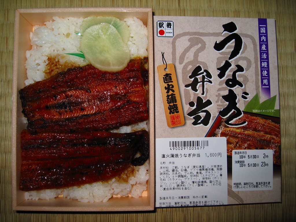 下記の駅弁「うなぎ弁当」の、2010(平成22)年時点での姿か。容器は5年前と同じままで、パッケージのデザインが変わり、中身はウナギ蒲焼が3切れから2切れに減り、大根漬物が桃色から黄色に変わり、価格が大きく上がった。