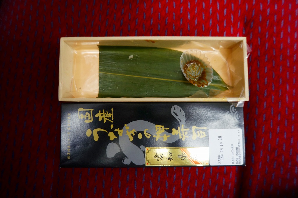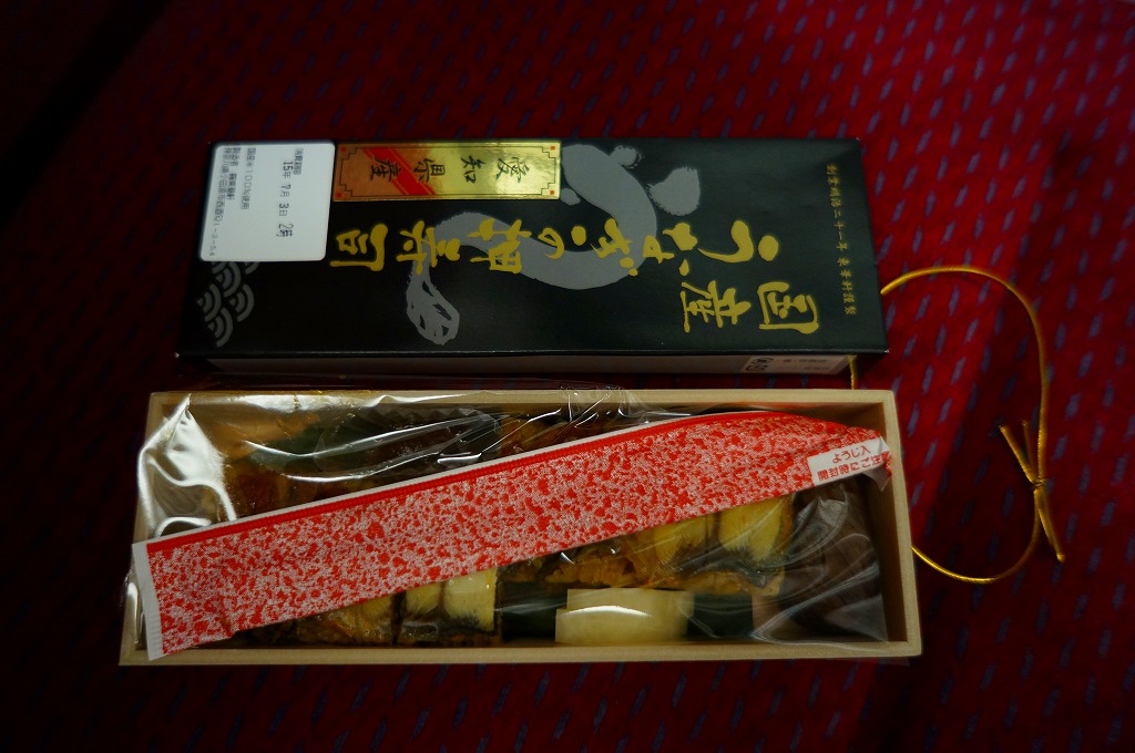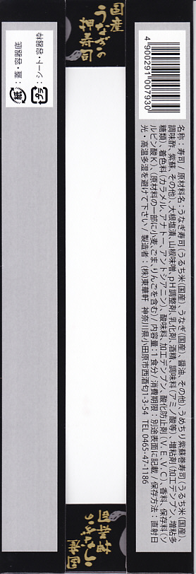 2012(平成24)年の発売か。当時はウナギとアナゴの押寿司と高菜巻とシソ巻で、2014(平成26)年からこの姿になった模様。真っ黒なボール紙でふたをした細長い容器に、タレに染まる酢飯に薄いウナギ蒲焼を貼り付けたウナギ押寿司が6切れ分と、シソ巻が1個と、山椒味噌を詰める。ウナギの高騰で仕方がないのだが、味も香りも食感も感じられない少量が悲しい。2015年までの販売か。