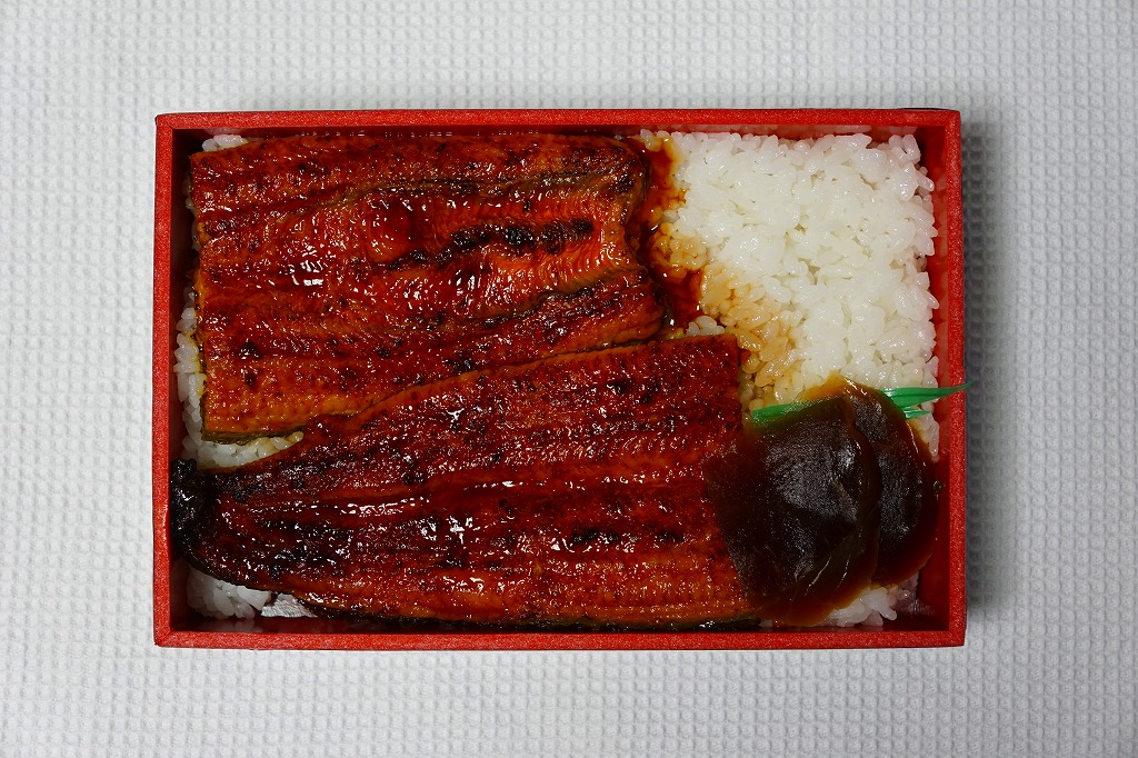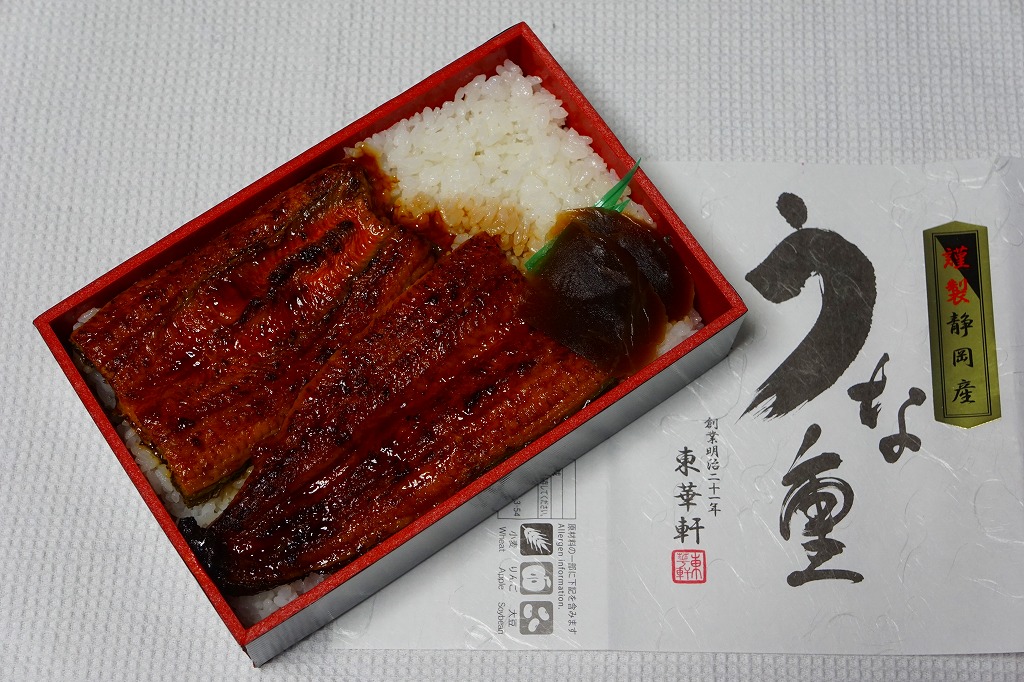 小田原駅で夏季限定のうなぎ駅弁。経木枠の長方形の容器に木版でふたをして、駅弁の名前と調製元社名を大きく記したシンプルな掛紙をかけて真っ白な紙ひもでしばる。中身は「鰻重」の一言、白御飯の上に関東風背開きの、香りと口当たりの良いふんわり鰻蒲焼がタレをまとい載るもの。庶民レベルの鰻重として最上位級の味で、東京から遠くないのに千円を切る価格がなかなか。
