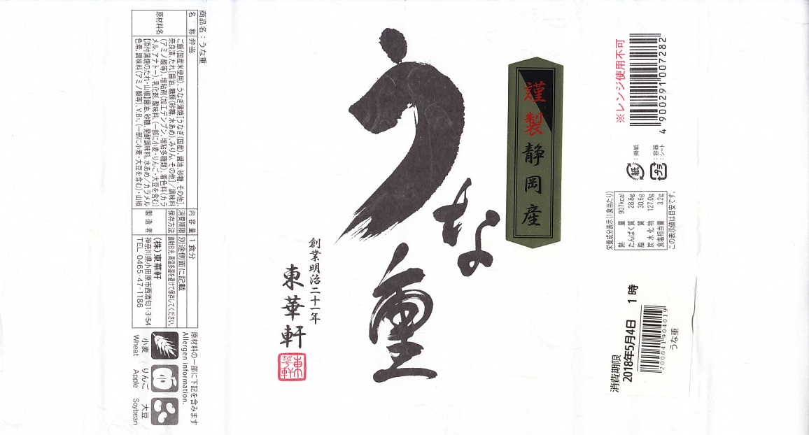 2019(平成31)年に従来の駅弁「うな重」をリニューアル。小田原駅でなく東京駅で売られる駅弁かもしれない。白い紙に商品名を記す掛紙の絵柄は、リニューアル前に似る。中身は白飯を錦糸卵とうなぎ蒲焼で覆い、奈良漬と添え、タレと山椒を付けるもの。そんなシンプルさも従前とほぼ変わらず、なぜ駅弁の名前を変えたのか不思議なところ。価格は2019年時点で2,400円、2022年6月16日から2,700円。2023年8月限りで終売の予定としたが、そのまま販売を継続した模様で、2024年時点で2,980円。