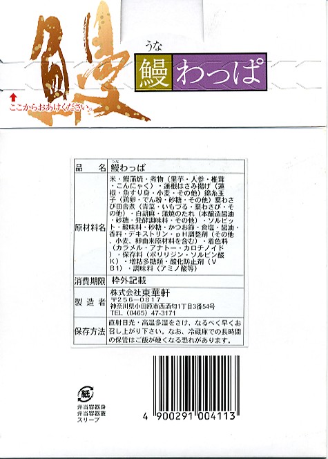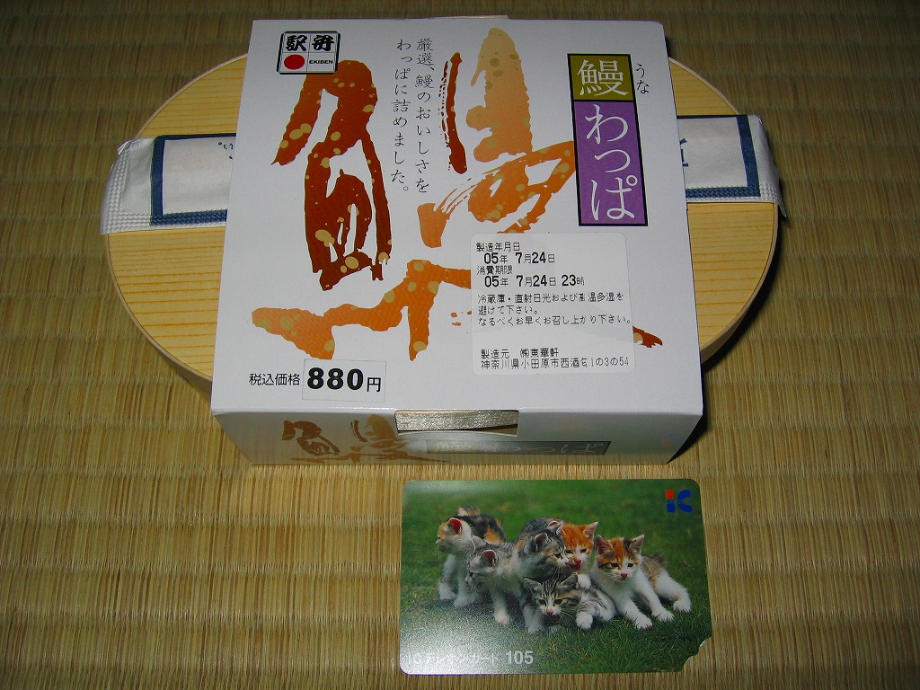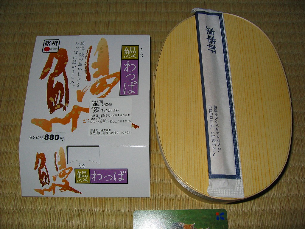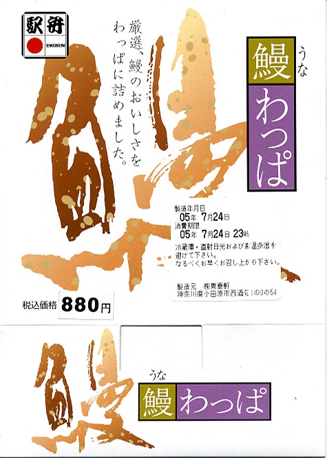 小田原駅で夏季限定のうなぎ駅弁の、2005(平成17)年版。風味や中身と価格は前年と同じで、パッケージは容器に紙のふたと大きく変わり、商品としての見栄えは向上したが、経木製容器が失われたのは残念だ。鰻蒲焼の大きさが昨年より小さく見えるのはロットの問題だと思うが、パッケージの写真ような巨大なものが載ることはないとも思う。