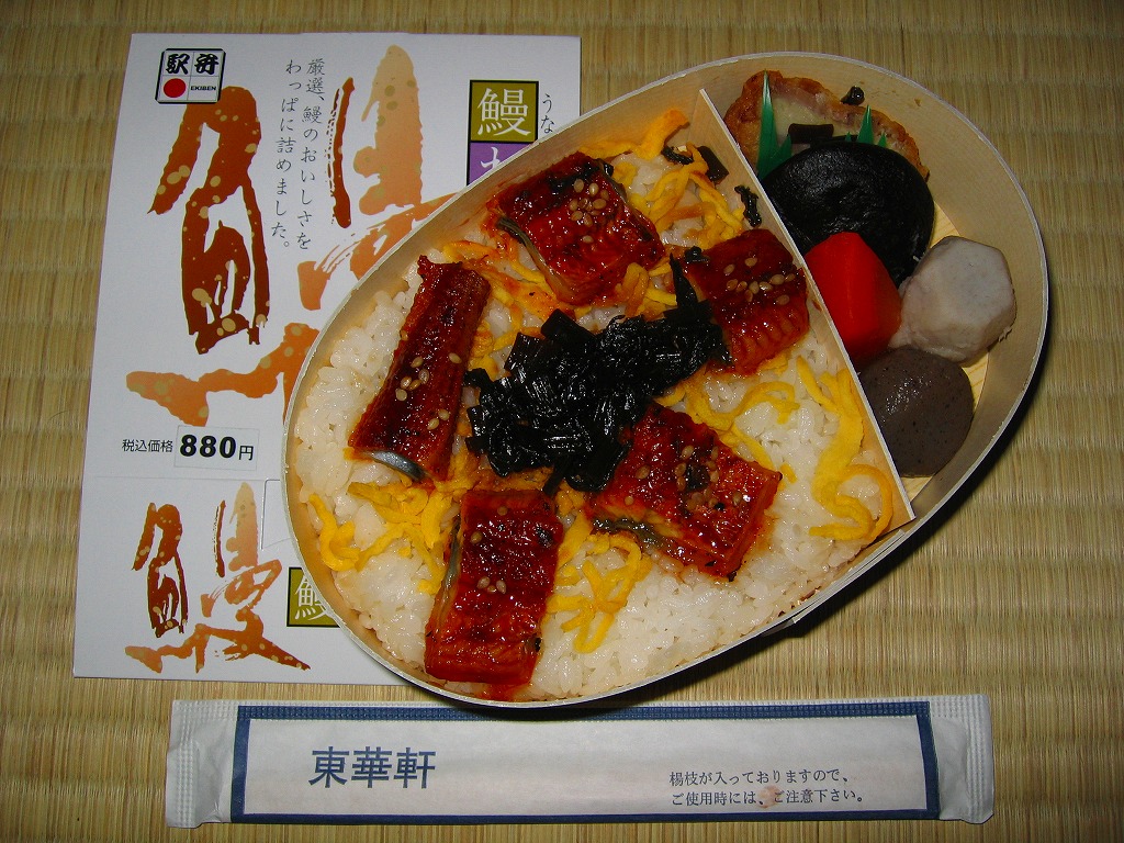小田原駅弁のうなぎ弁当は現地では、6月から7月までの間を除き買えたためしがなく、しかしこの時点で東京駅の駅弁売店「駅弁屋旨囲門」では通年で販売する定番の商品になっている。中身は直球勝負、しかし今回の鰻は臭かった。資源の枯渇が深刻化する中、国産を偏重し過ぎるのも良くないのかと。なお、小田原駅のウナギ駅弁は、2015年時点で「うな重」(2,310円)になっている。
