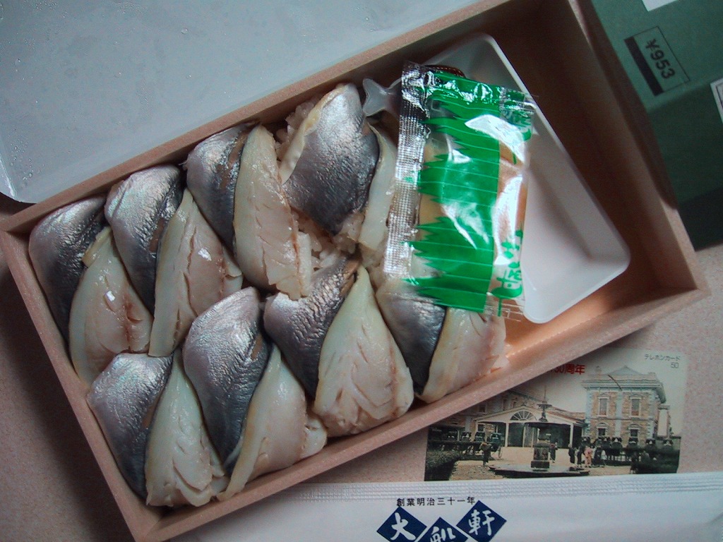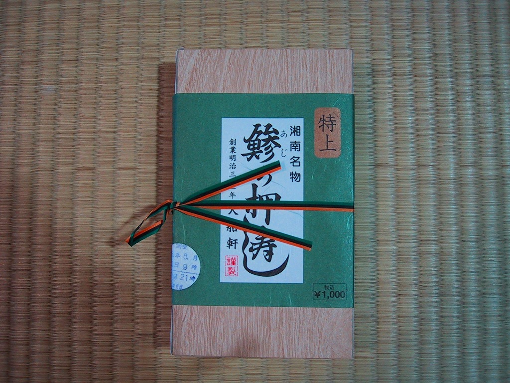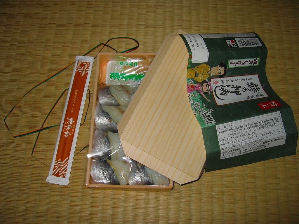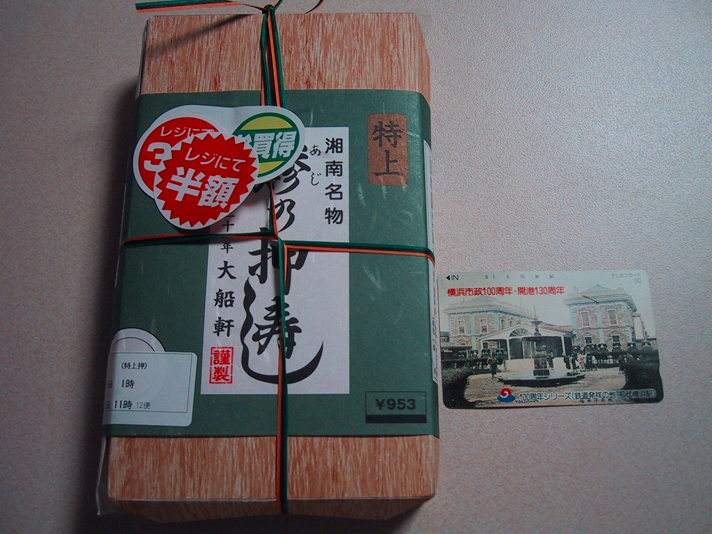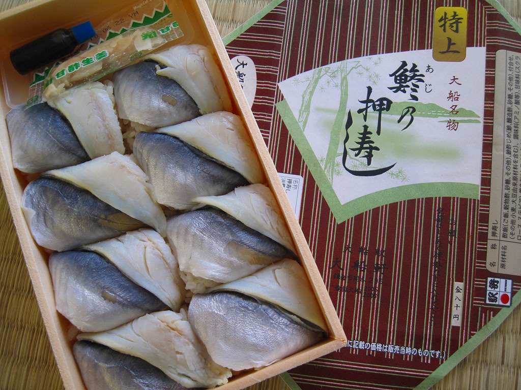 大船駅で百年の歴史を刻む伝統の駅弁「伝承鯵の押寿し」の、2001年時点での姿。中身は変わらないし、いつまでも変わらないと思うが、当時はスリーブでなく掛紙を使い、容器は少し大きかった。この昔ながらのバージョンは、過去には材料が入った時のみ作るとした記事があり、掛紙に「限定生産品」と書いた時期があった模様。