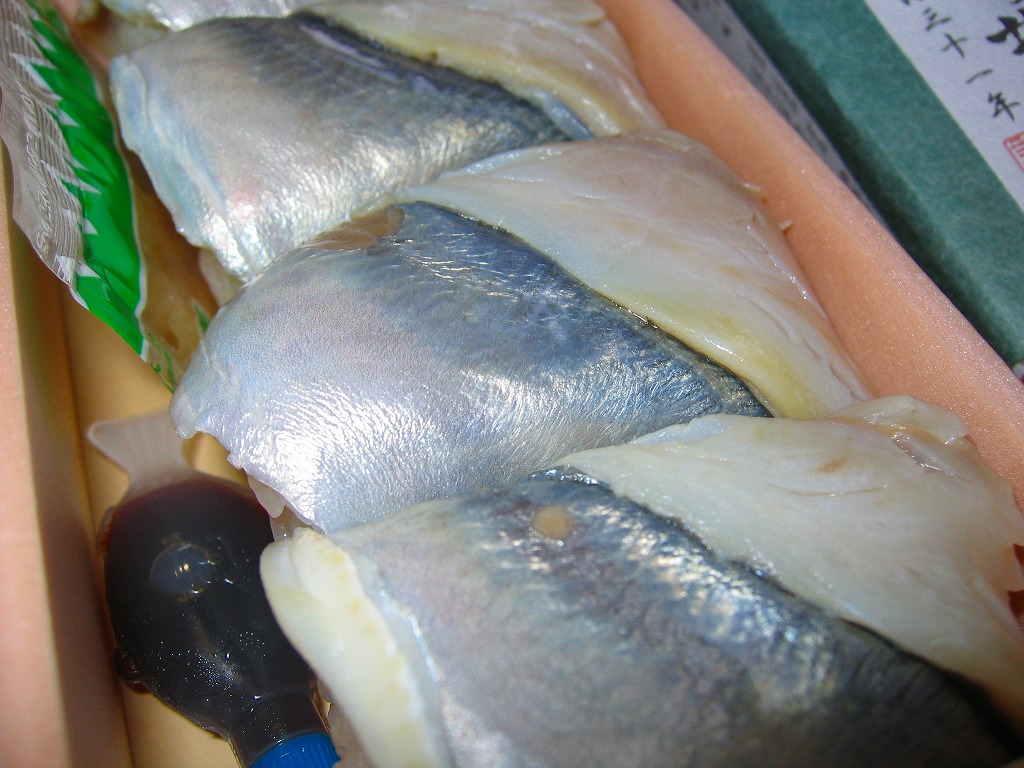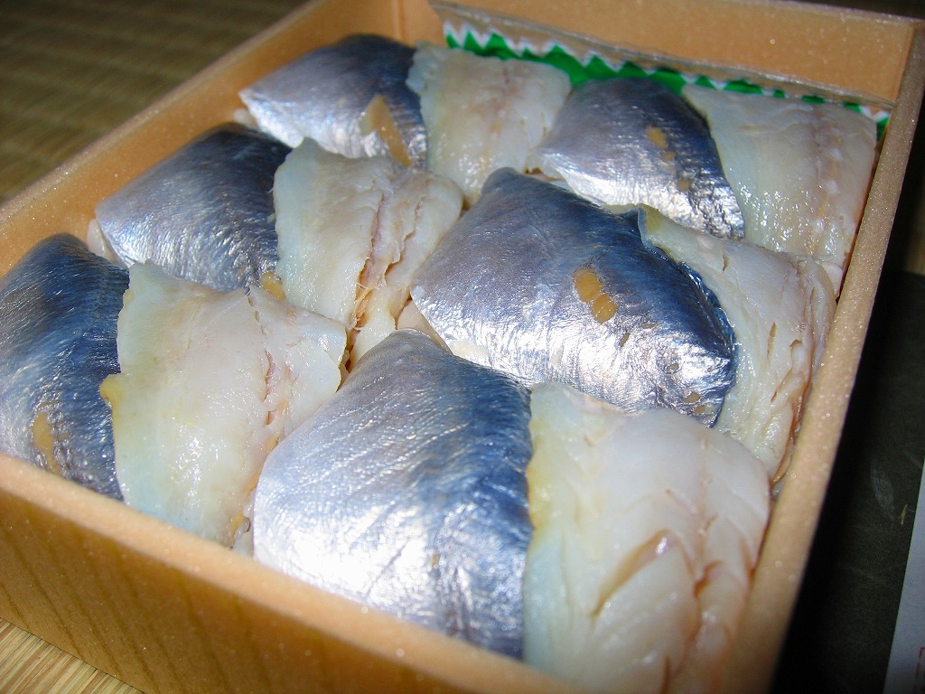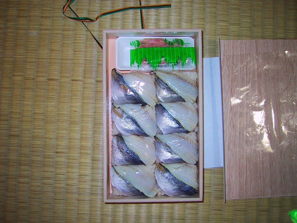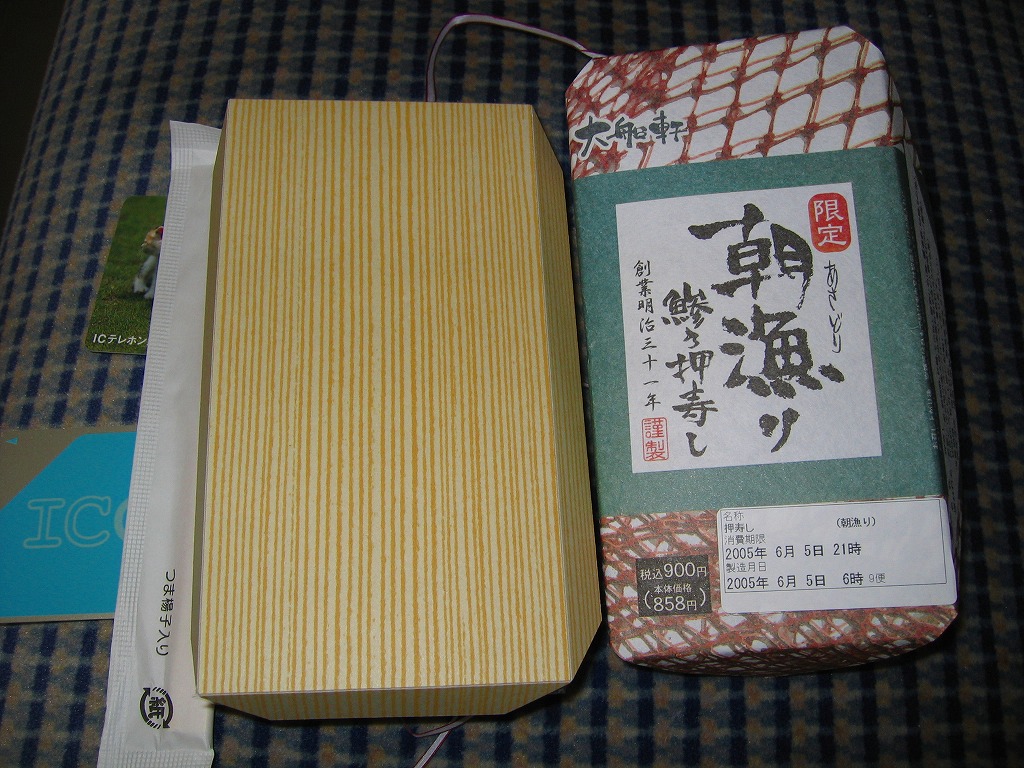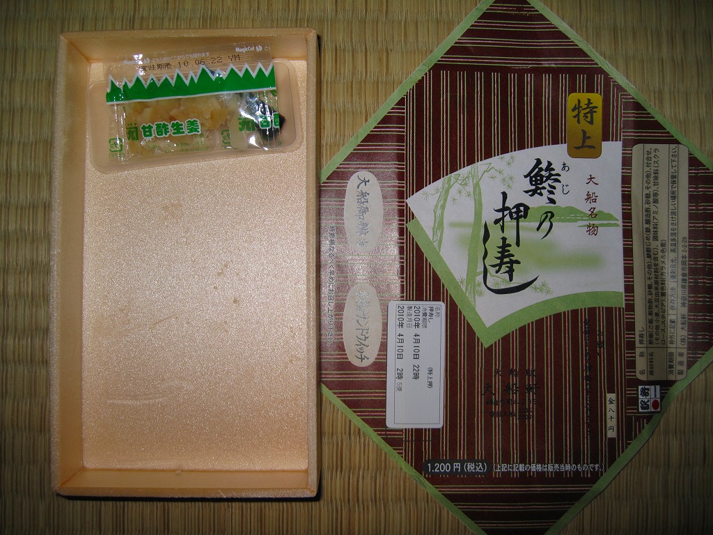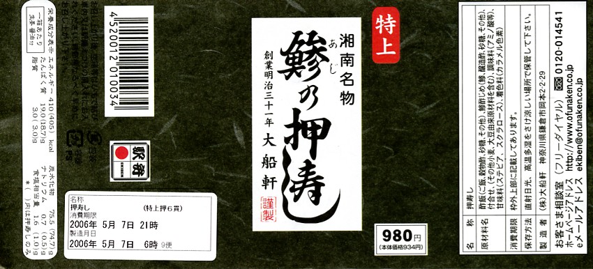 大船駅で百年の歴史を刻む伝統の駅弁「伝承鯵の押寿し」の、2001年時点での姿。中身は変わらないし、いつまでも変わらないと思うが、当時はスリーブでなく掛紙を使い、容器は少し大きかった。この昔ながらのバージョンは、過去には材料が入った時のみ作るとした記事があり、掛紙に「限定生産品」と書いた時期があった模様。