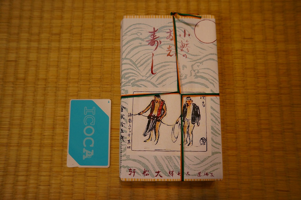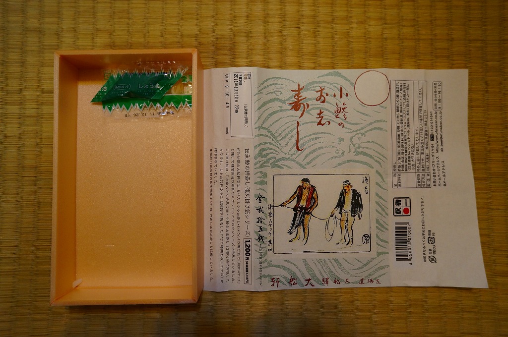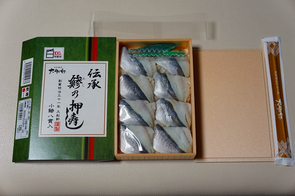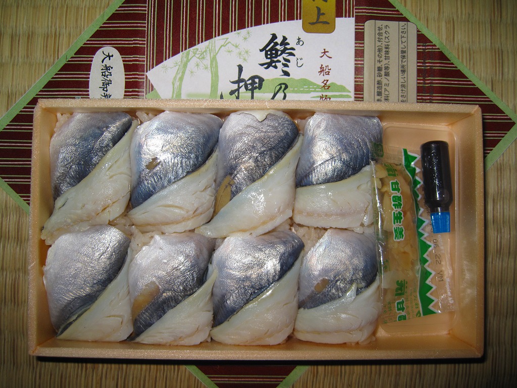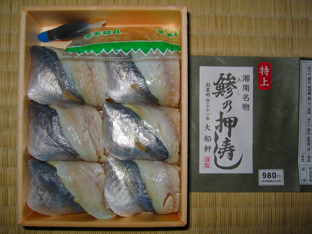 中身はマアジのSサイズ「小あじ」を、半身で酢飯に巻き付けて握り、8個まとめて押した、「関東風に握り、関西風に押す。」と紹介するアジの押し寿司。かつて相模湾でふんだんに獲れたといい、明治・大正時代には沿岸の鎌倉・大船や国府津・小田原の駅弁になった。今では酸味が強すぎる昭和までの味に思えるが、これも伝統ということで。