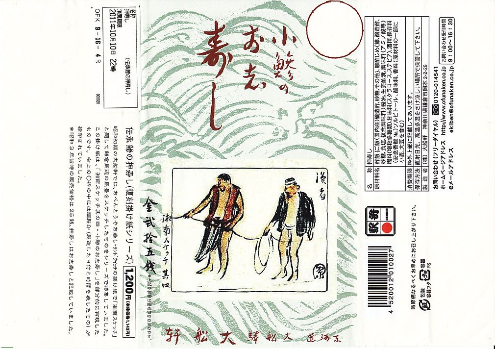 2011(平成23)年10月8日から10日までに東京駅で開催された「第14回東日本縦断駅弁大会」で販売されたお弁当で、昔の大船駅弁を復刻したもの。といっても復刻は掛紙だけであり、容器や中身や価格は現行の駅弁「特上鯵の押寿し」と同じである。1928(昭和3)年当時の掛紙で復刻したようだが、すべて手書きの絵柄は見るからにデザインのかけらもなく、カラーコピーの質感といい、なぜ今回これを持ち出したのか不思議に思った。