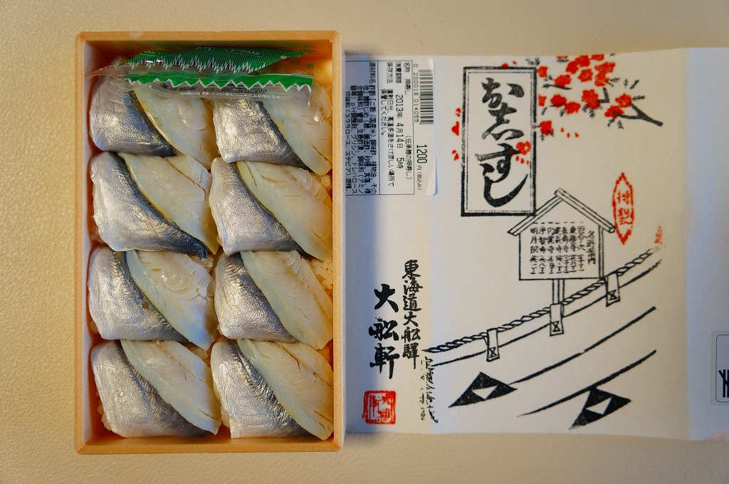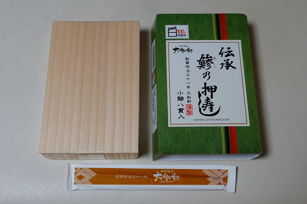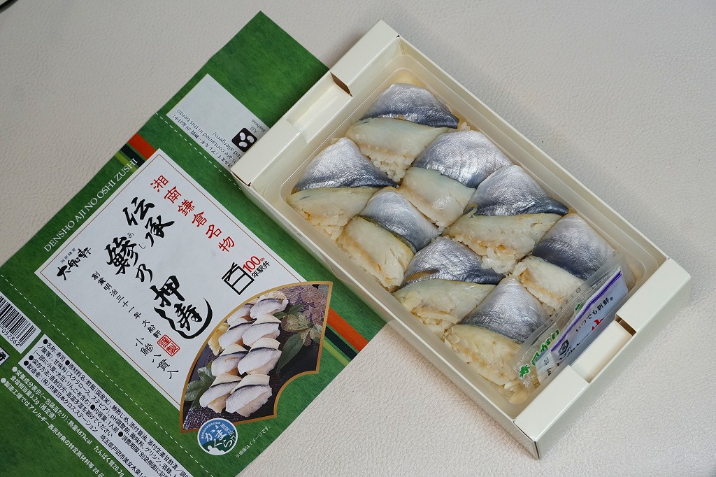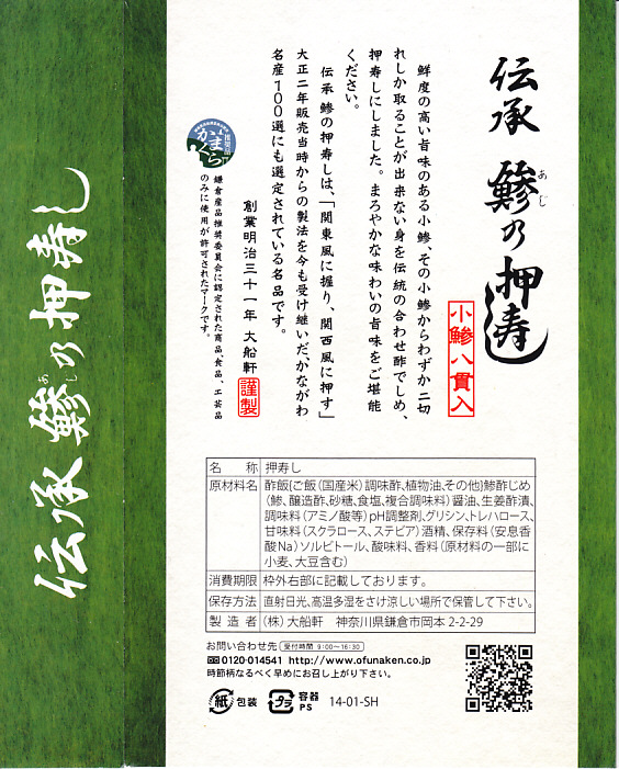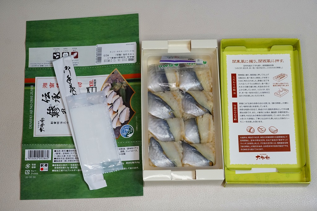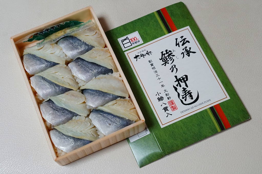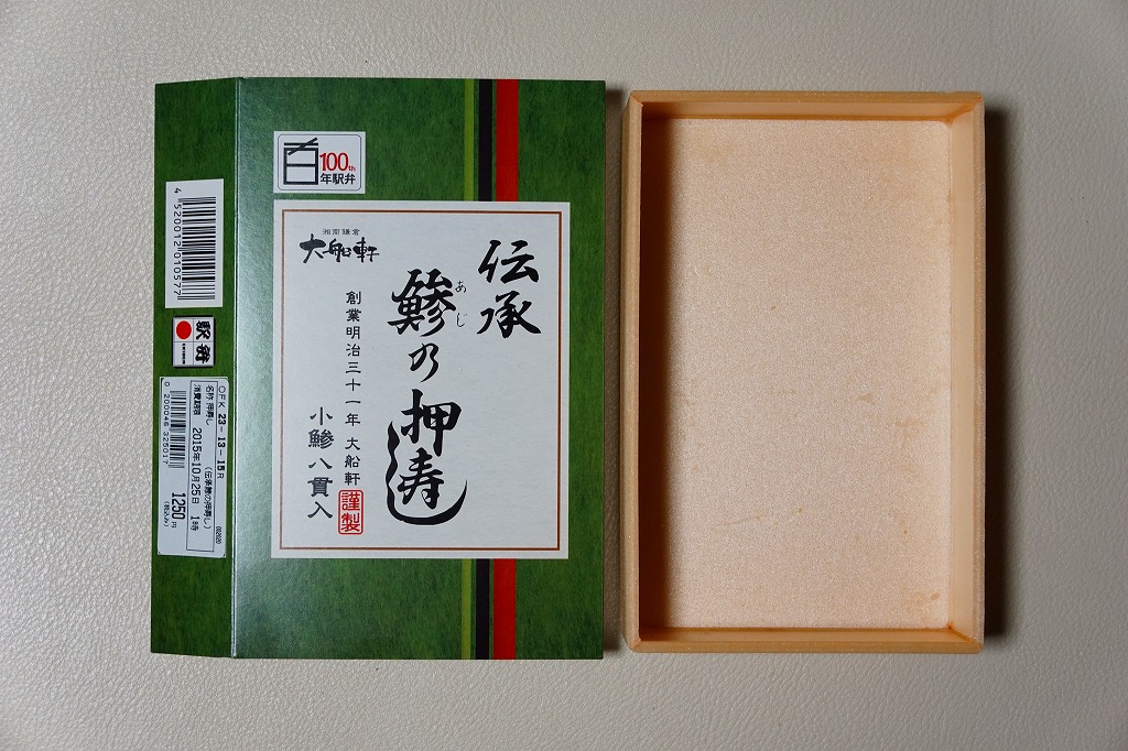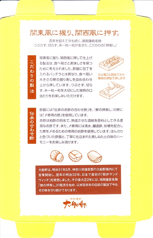 1913(大正2)年4月に大船駅で発売。汽車の時代から東海道線や横須賀線の旅客に、鎌倉の文人や大船の映画人などに愛された、伝統の駅弁。2023年の4月末までに使い始めた紙容器に、抹茶色あるいは竹色に見本写真と商品名を美しく描いた掛紙を巻く。掛紙の裏面で鯵の押寿しの歴史を、中ぶたでその特徴を、多くの文字で紹介する。
