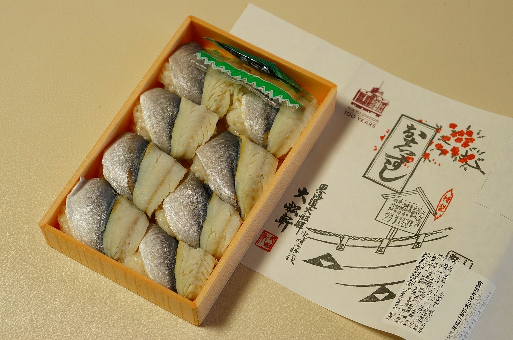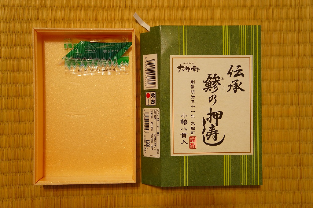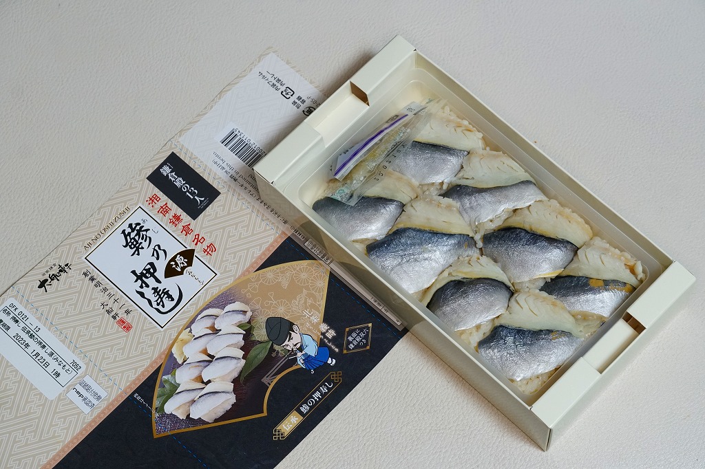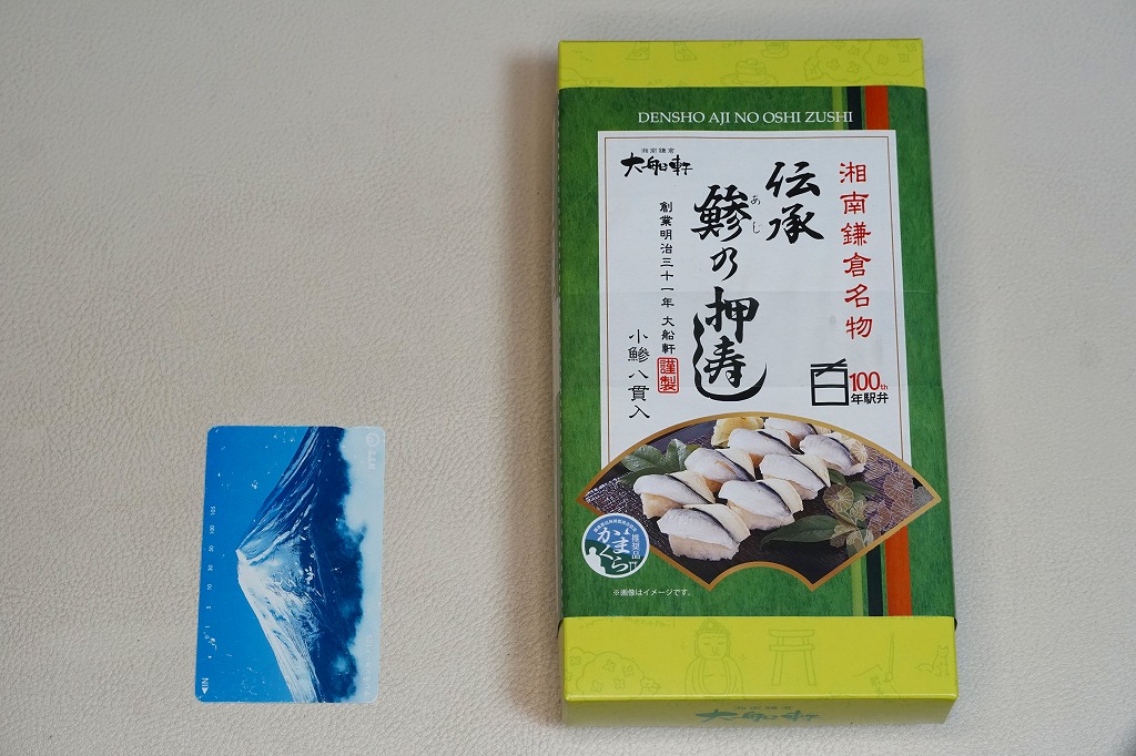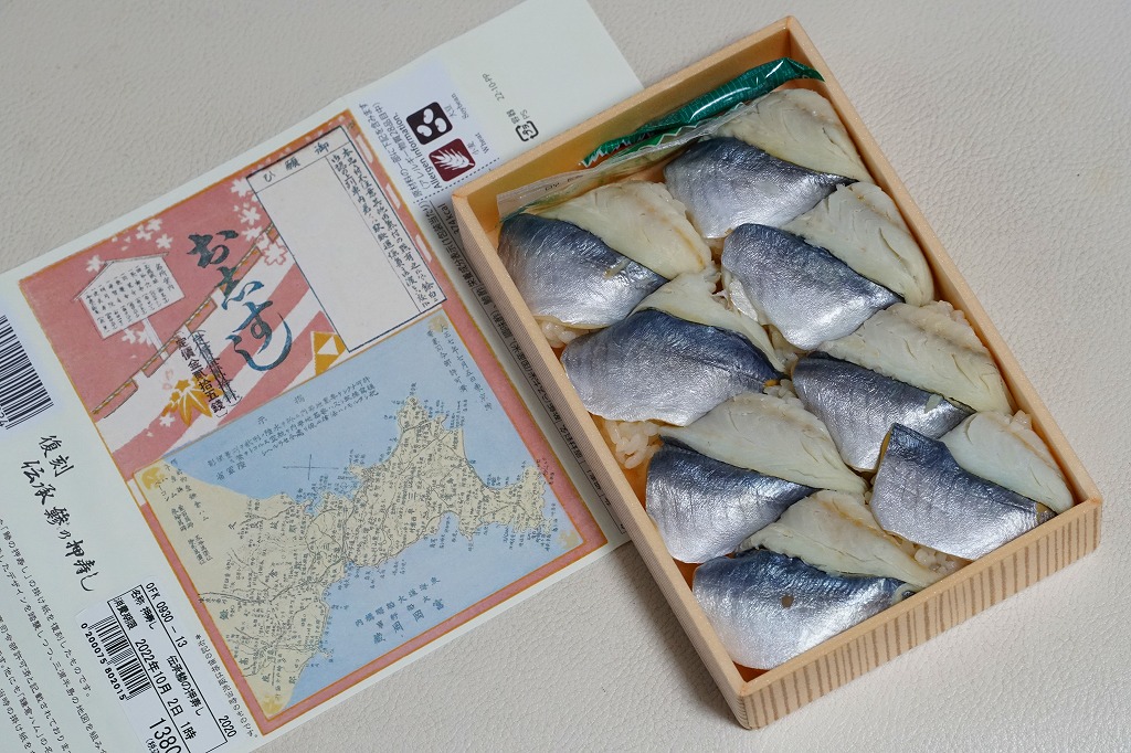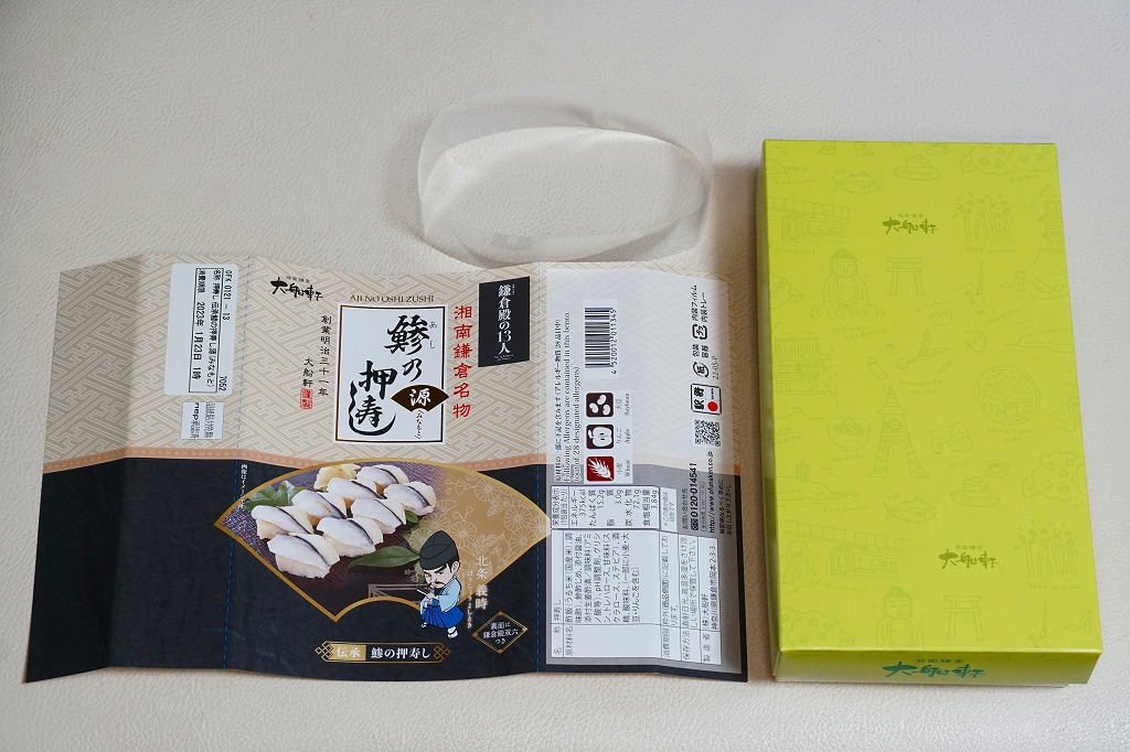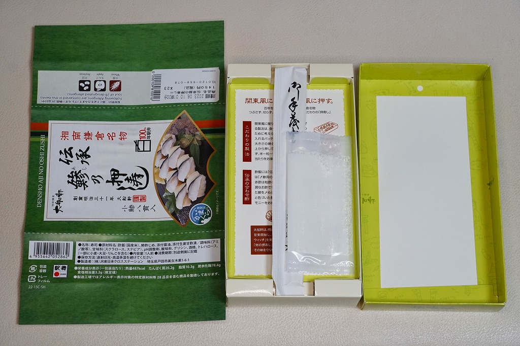 1913(大正2)年4月に大船駅で発売。汽車の時代から東海道線や横須賀線の旅客に、鎌倉の文人や大船の映画人などに愛された、伝統の駅弁。2023年の4月末までに使い始めた紙容器に、抹茶色あるいは竹色に見本写真と商品名を美しく描いた掛紙を巻く。掛紙の裏面で鯵の押寿しの歴史を、中ぶたでその特徴を、多くの文字で紹介する。