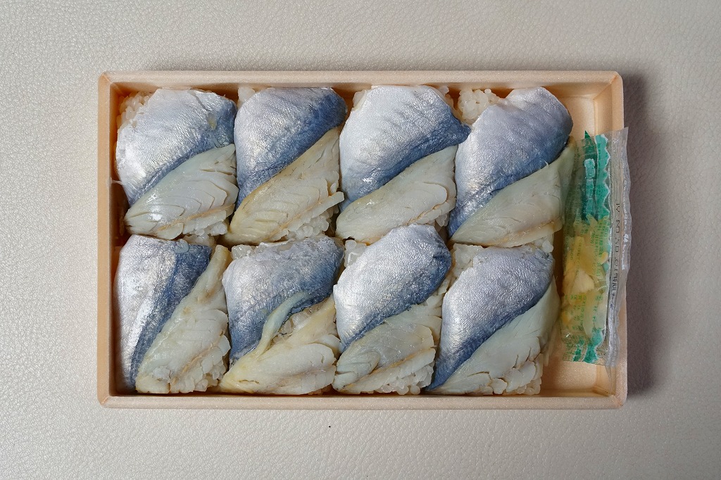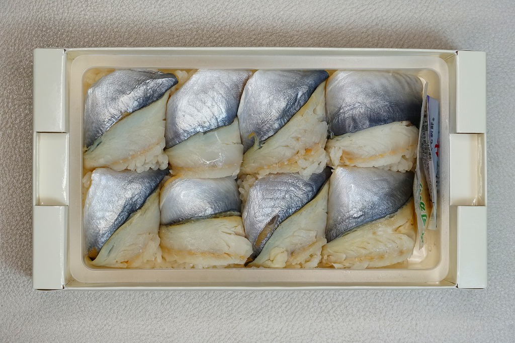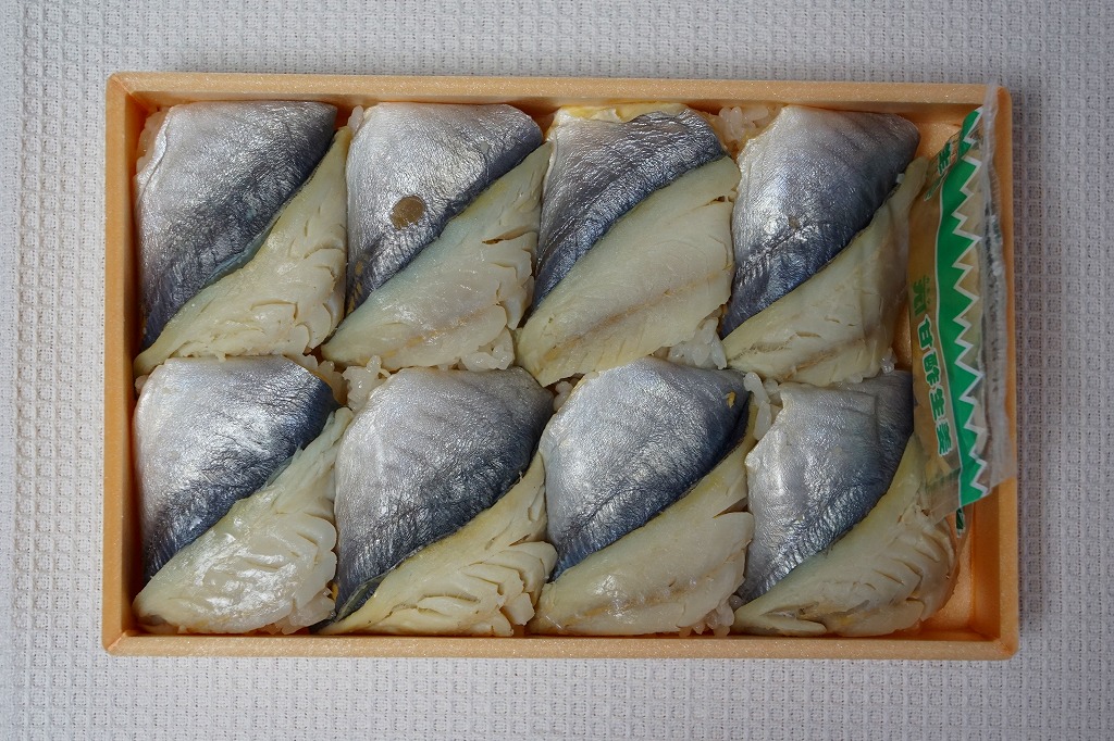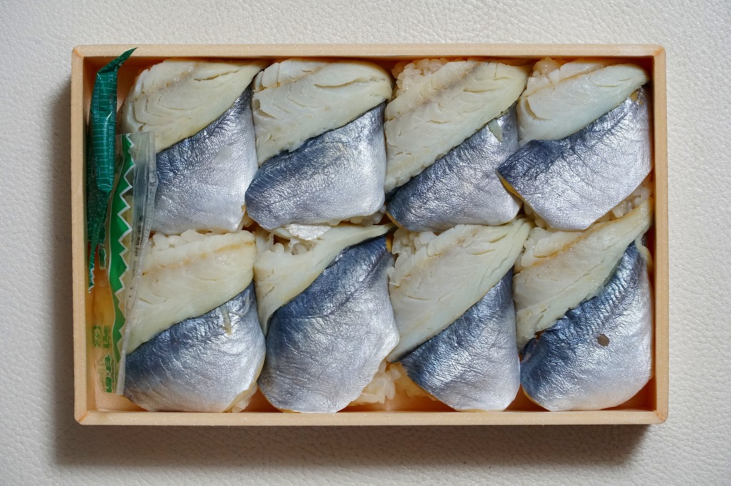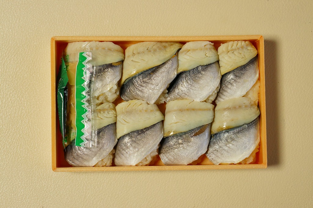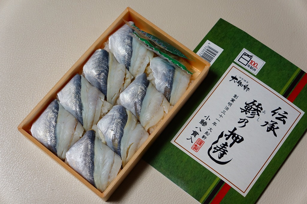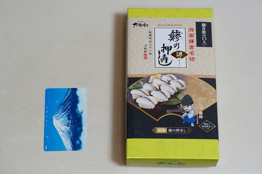 1913(大正2)年4月に大船駅で発売。汽車の時代から東海道線や横須賀線の旅客に、鎌倉の文人や大船の映画人などに愛された、伝統の駅弁。2023年の4月末までに使い始めた紙容器に、抹茶色あるいは竹色に見本写真と商品名を美しく描いた掛紙を巻く。掛紙の裏面で鯵の押寿しの歴史を、中ぶたでその特徴を、多くの文字で紹介する。