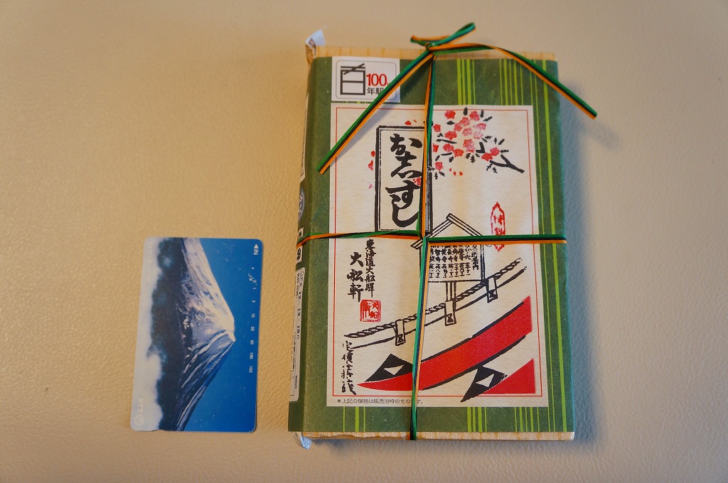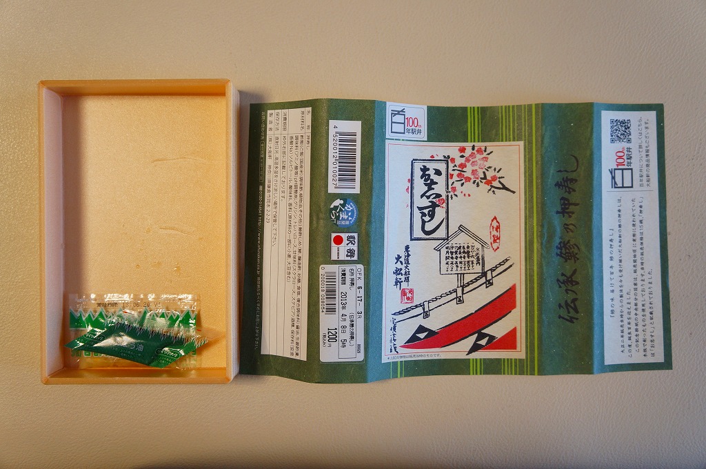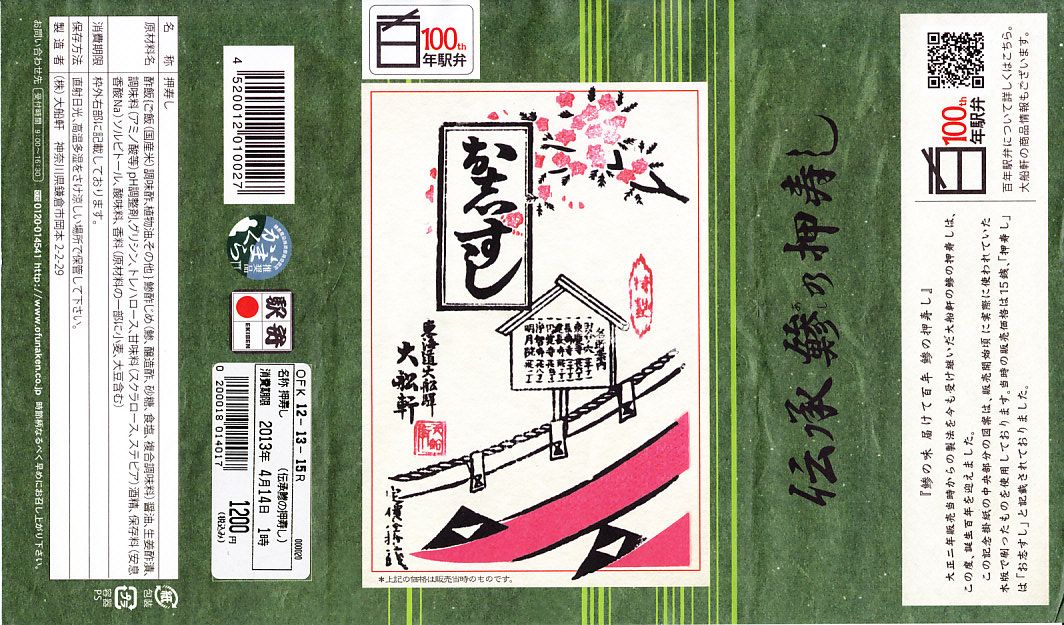2013(平成25)年4月13日に購入した、大船駅弁の掛紙。大船駅弁「鯵の押寿し」誕生百年を記念して、2013年4月10日から14日まで、大船駅と東京駅で300個ずつが、調製元が保管していた百年前の版木で刷った和紙の掛紙を使い販売された。それなのに食品表示ラベルとリサイクル識別表示マークと百年駅弁のロゴのシールを、掛紙そのものに貼ってしまったのは残念。価格と中身は通常版と同じ。