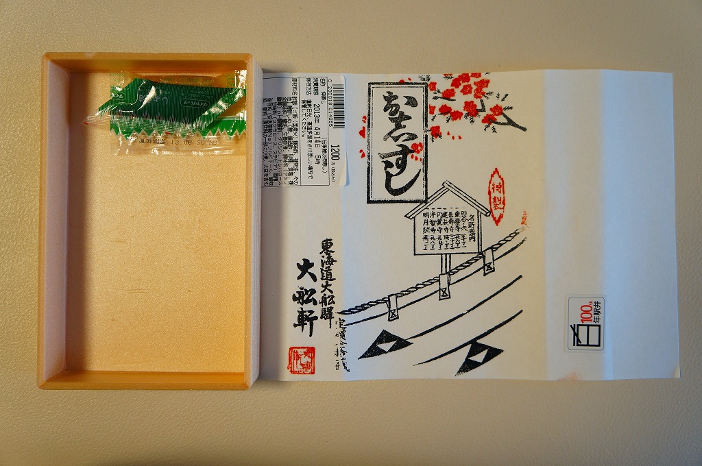 2013(平成25)年4月7日に購入した、大船駅弁の掛紙。上のものとまったく同じはずが、こちらは法定のリサイクルマーク「紙」「プラ」がついていないエラー掛紙。