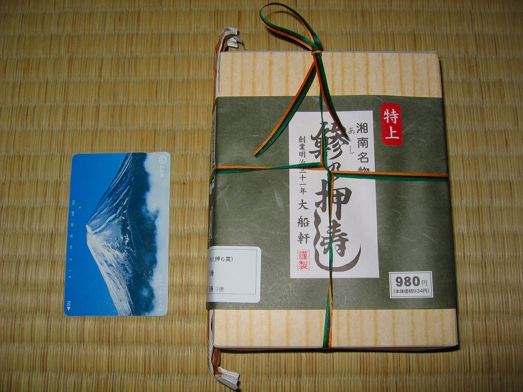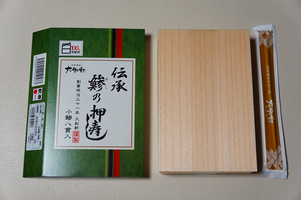 2005(平成17)年2月26日に発売された、同年8月末頃までの期間限定駅弁。とても小さな長方形の容器に木目調の紙のふたをして、掛紙をかけて紙ひもでしばる。中身は大船駅弁名物「鯵の押寿し」が4個だけ入るもの。一日100個程度の限定販売。
