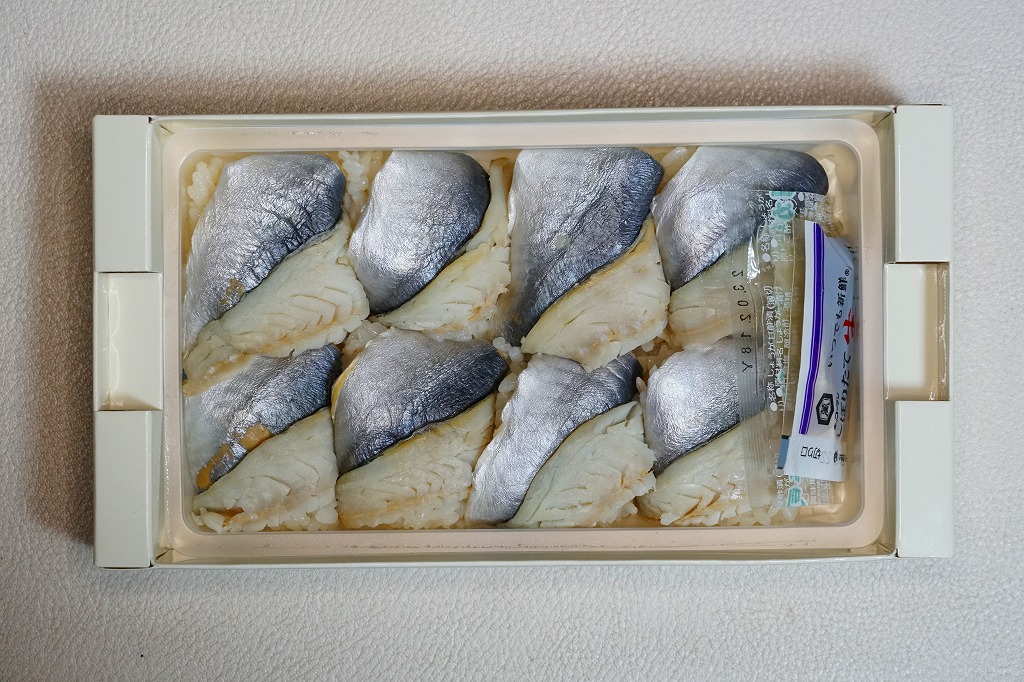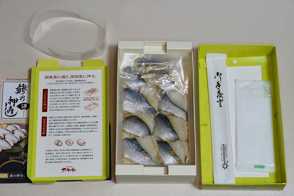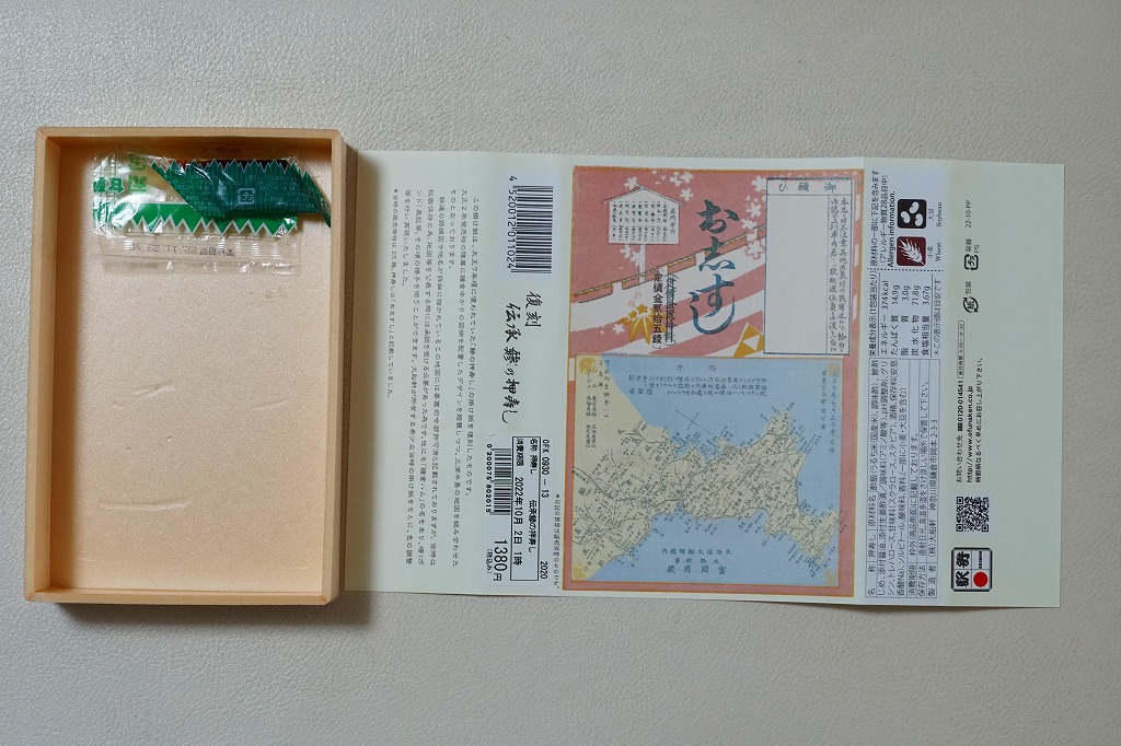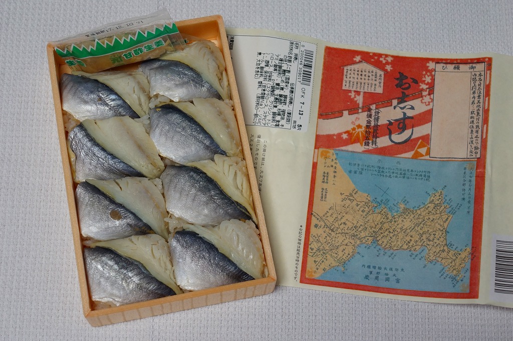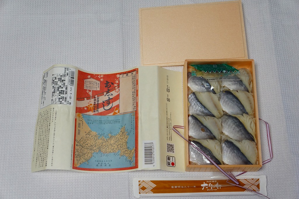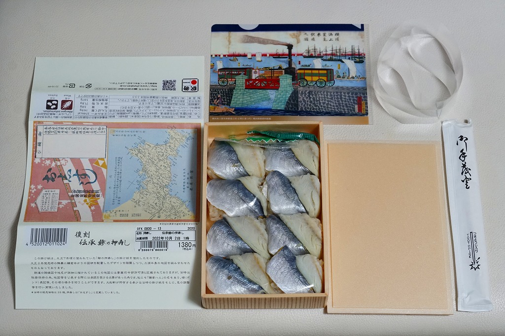 大船駅弁「伝承鯵の押寿し」の復刻版というが、下記にある以前のものと同じく、中身は上記の通常版と同じで、掛紙に昔のものの絵柄を取り入れた。今回はその絵柄も、5年前の2017年10月から11月までのときと同じ大正7年頃のもので、これをなぜか色を薄めて使う。酸味の強い、半身の小アジの握り風の押し寿司。